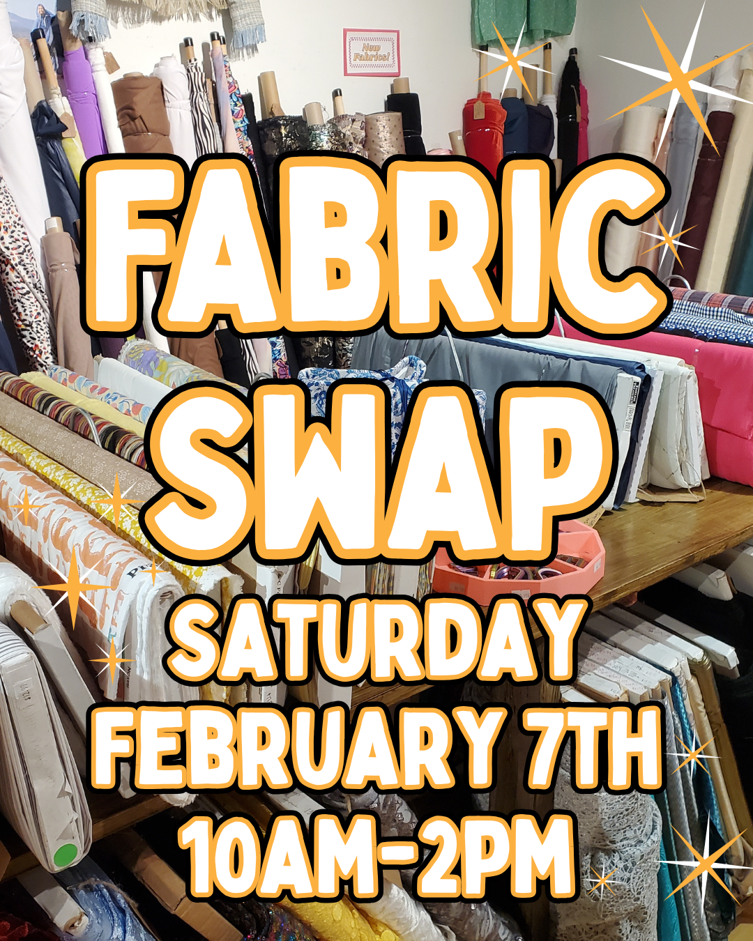 Come one come all! On Saturday February 7th from 10am-2pm we will be hosting a fabric swap! We will have tables and chairs set up for everyone to show off their stashes and trade among each other. Any fabric is welcome (quilting, apparel, home dec), and it can be helpful to have it measured and possibly priced before hand. If you have any questions please reach out! We are excited to have you all!