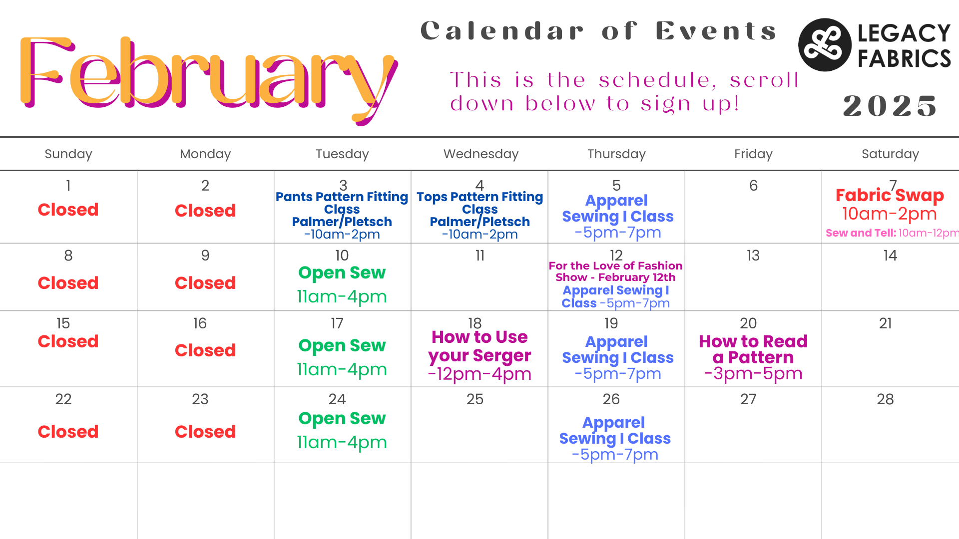 We also do Private Sewing lessons for those who learn best with one on one attention, or for those trying to learn a niche sewing skill! Please contact us at info@legacyfabrics.com or give us a call at (913)494-2656 to get pricing and set some up!