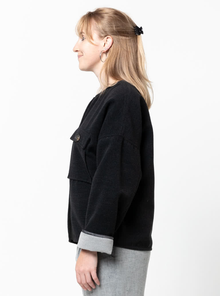 The Adelaide Woven Jacket sewing pattern creates a boxy-fit jacket with both lined and unlined options. The unlined version can be finished with facings or inside binding on the seams. It also includes optional patch pockets with flaps and optional inseam pockets for added versatility.