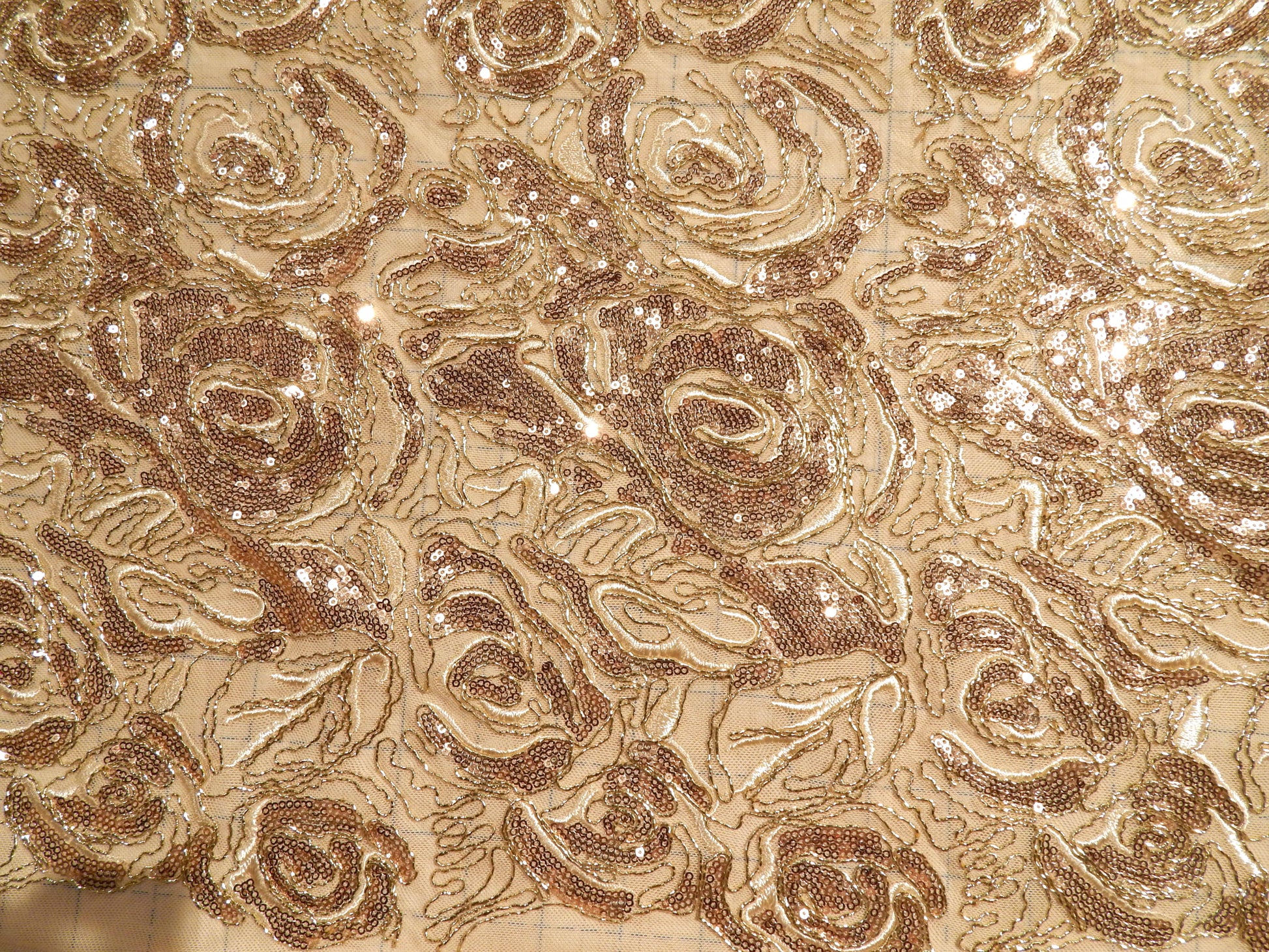 This stunning Birch Sequined Blossom Embroidery Mesh Lace is glitzy, showy, and will elevate all your designs. Embroidered onto a 2 way stretch mesh, this lace is super soft and smooth. It has more give than a normal lace, although does not retain the properties of a mesh fabric because of the amount of sequins and beads. The ornate sequined gives it a uniqueness that won't be found anywhere else. The fabric has nice a density and drape to it. Use this for a formal dress, evening bag, or upscale blouse.