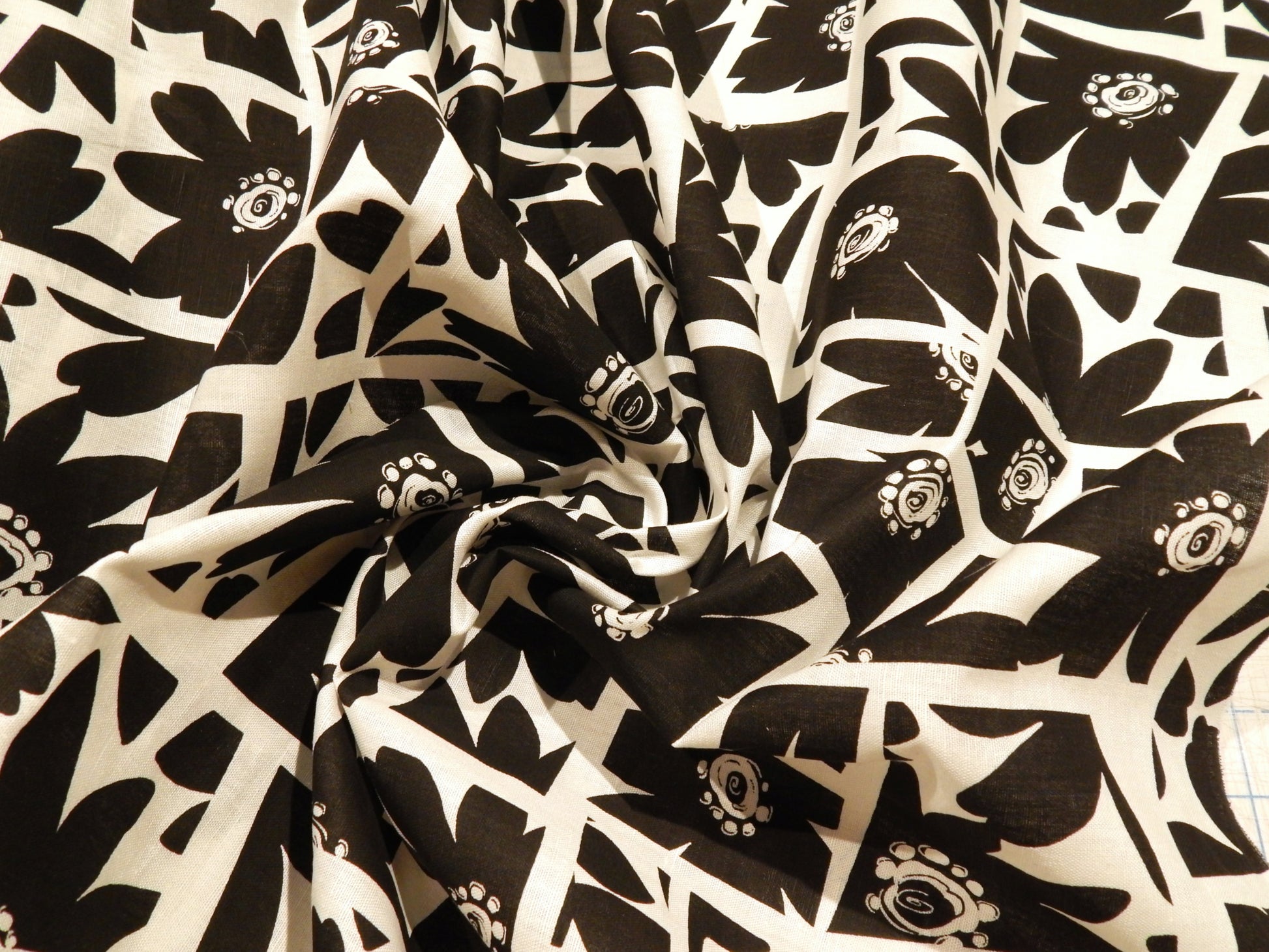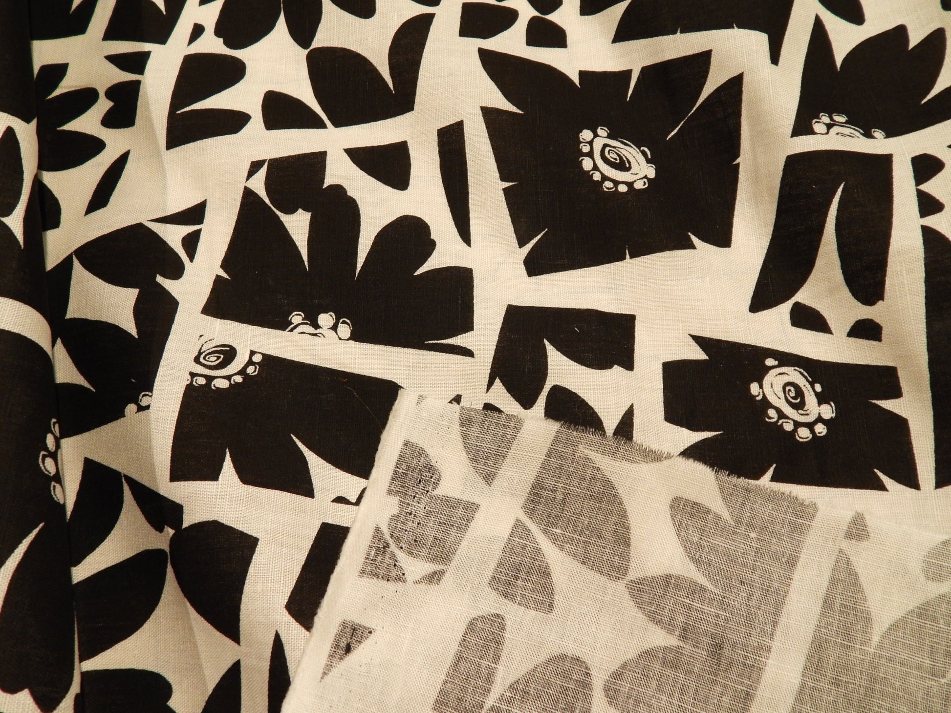 This Black and White Daisy Abstract Linen is a fun take of a floral pattern. The "block print" type motifs have been spliced and rearranged in an interesting geometric abstract style. This makes it so you'll never have to match a seam! Yay! It is a print, so only one side has the design, although they are still slightly visible from the back. Use this to make a fun blouse, funky barrel leg pants, or even a neck kerchief.