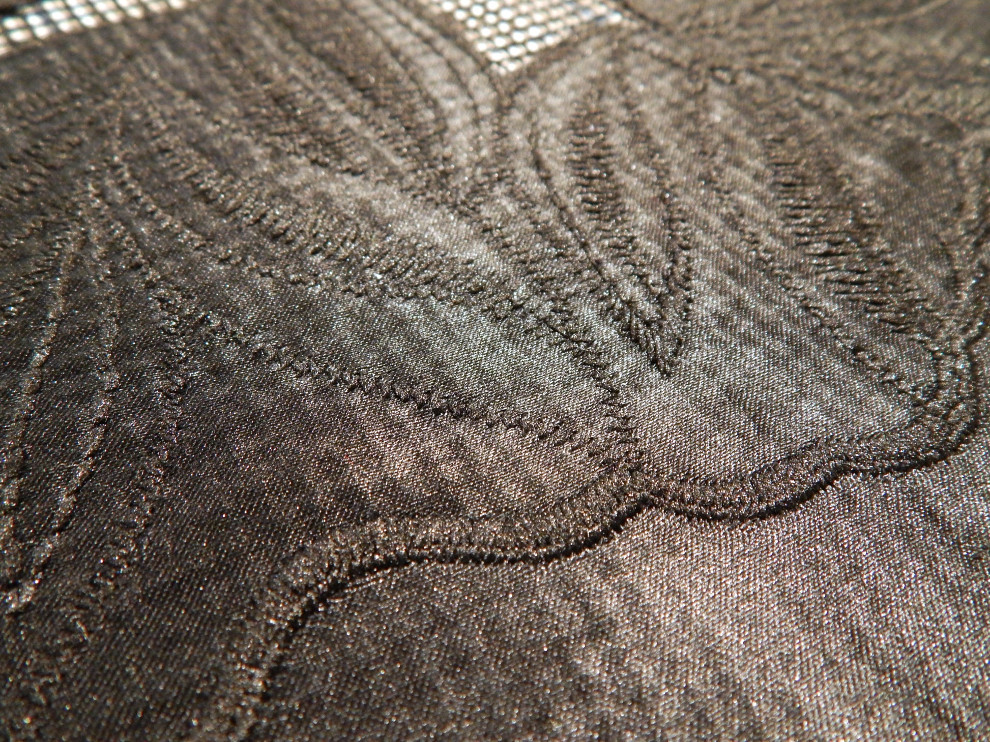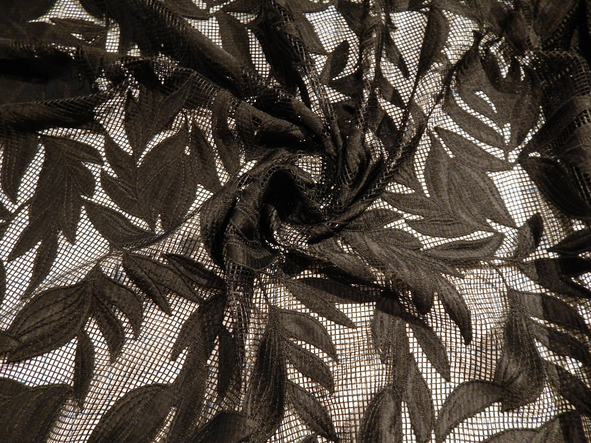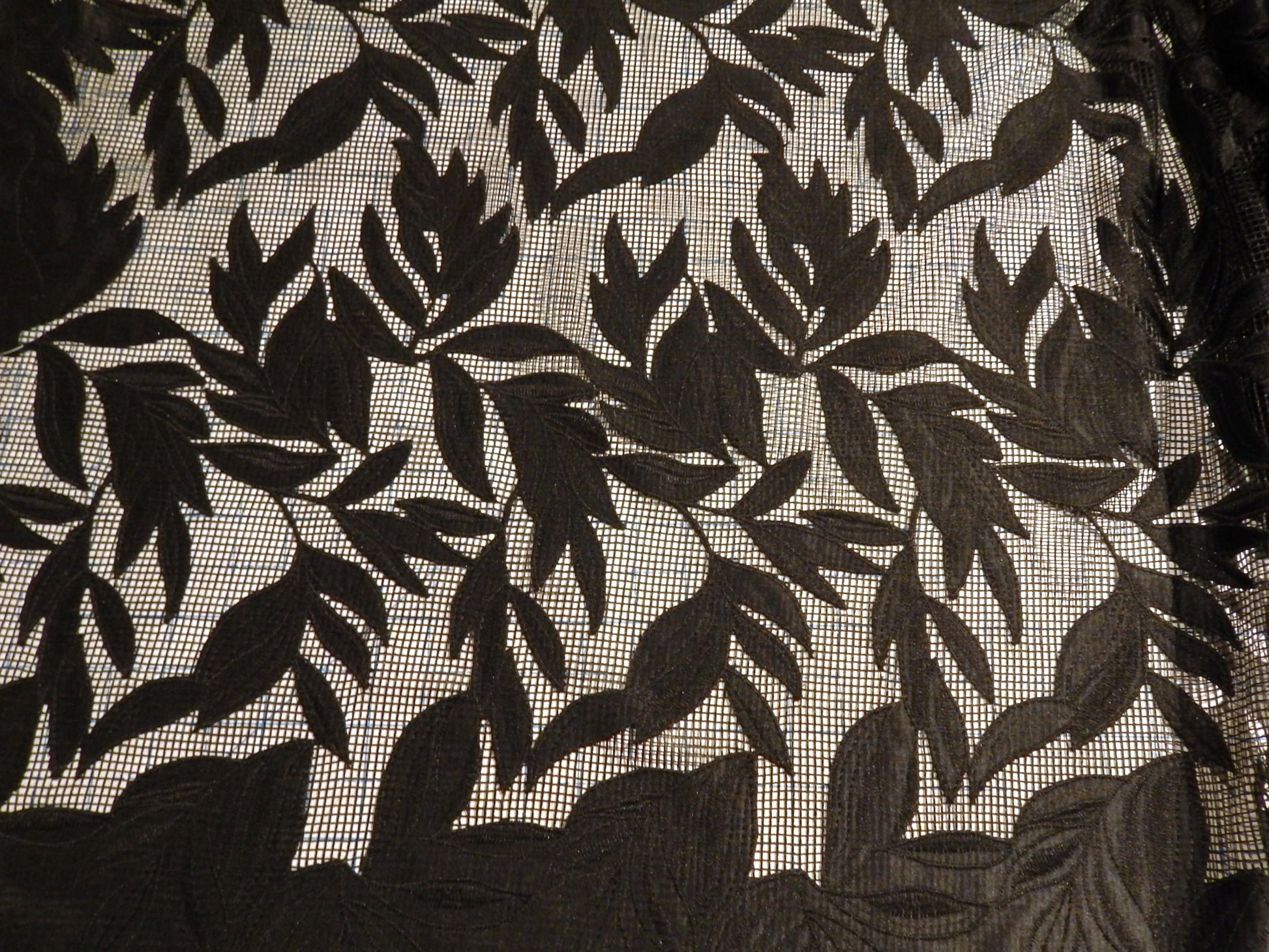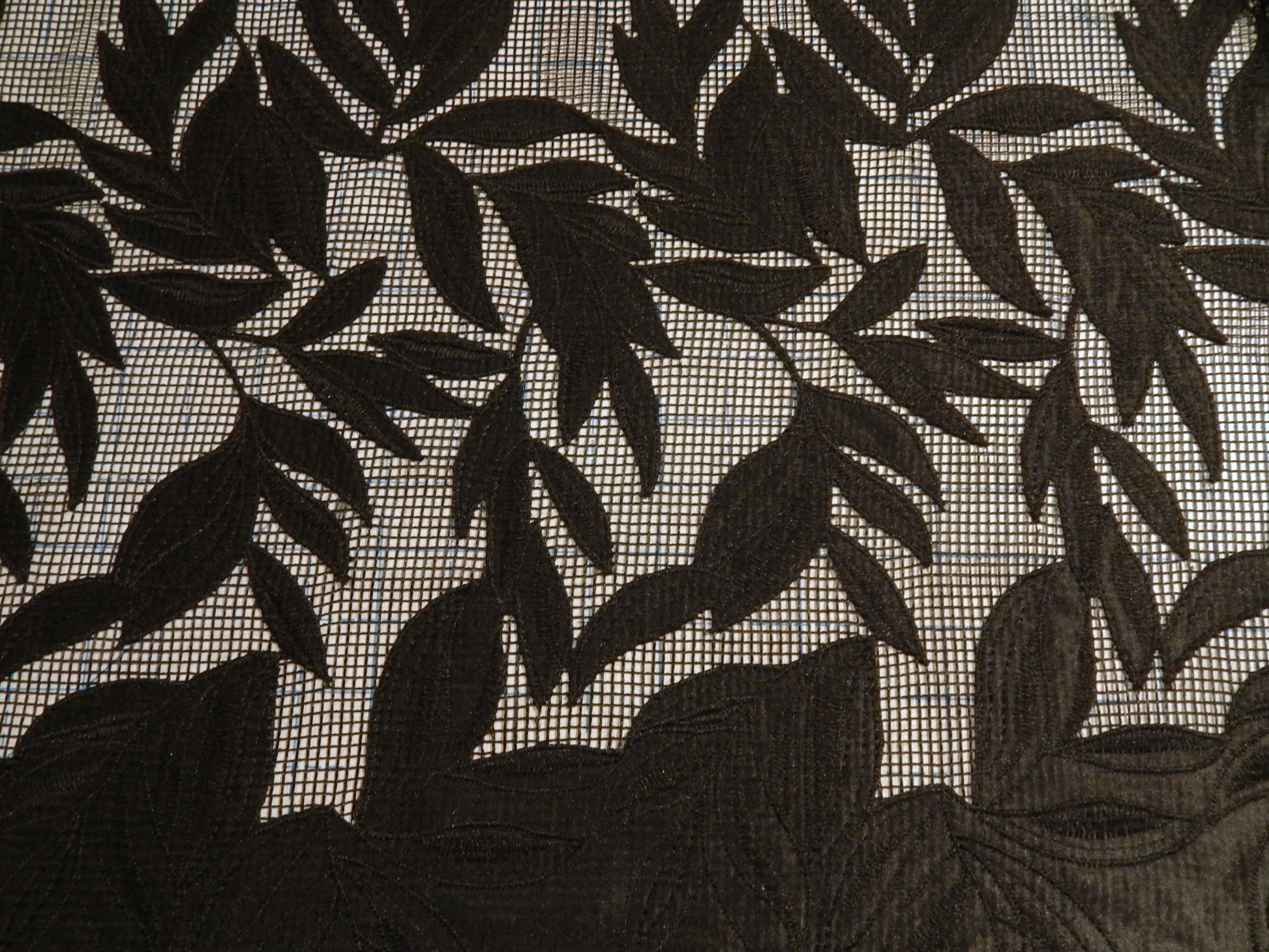 This stunning Black Hatched Satin Applique Lace is unlike any other lace type fabric we've seen before. The leaves are made out of a satin applique that has been stitched onto a loosely woven, almost cross stitch style background fabric. This gives it an architectural feel and modern vibe. The selvage of this fabric has been left to be optionally finished by trimming to a scallop edge, or hemming for a wider band of black. Use this for a fancy cruise coverup, evening dress, or statement skirt!