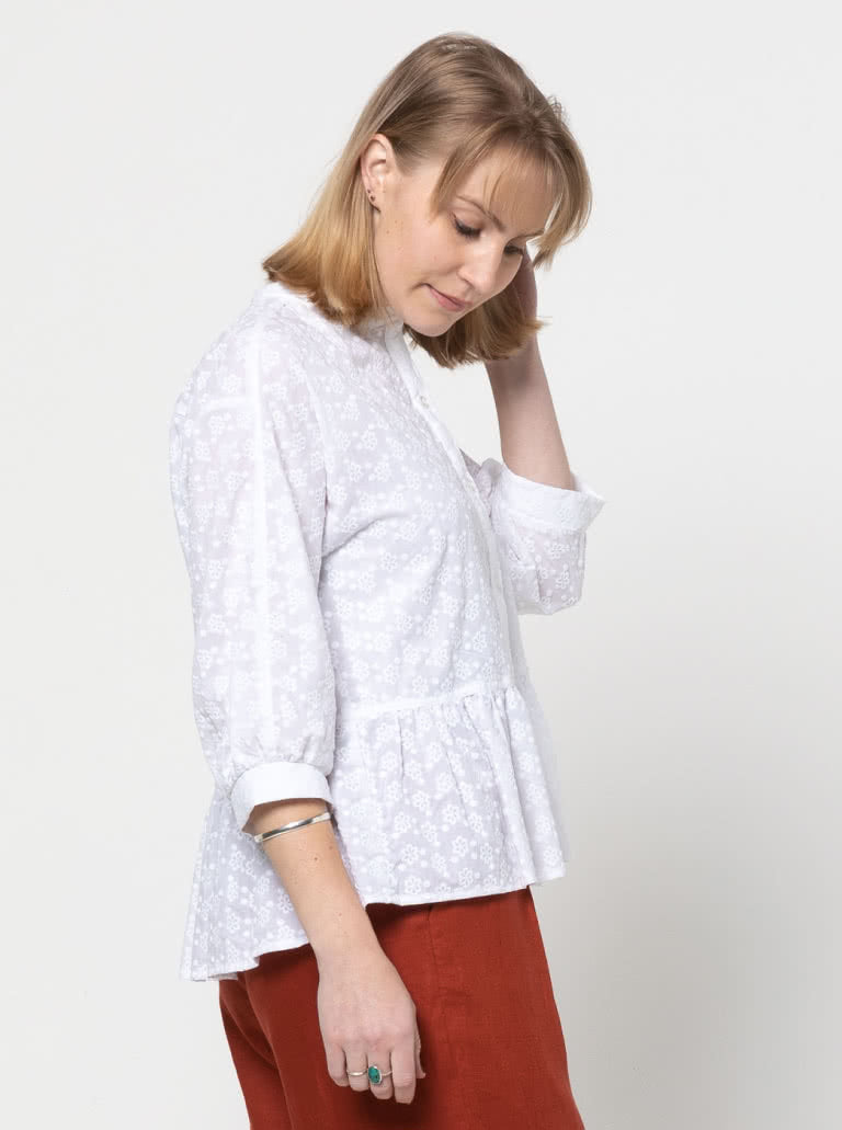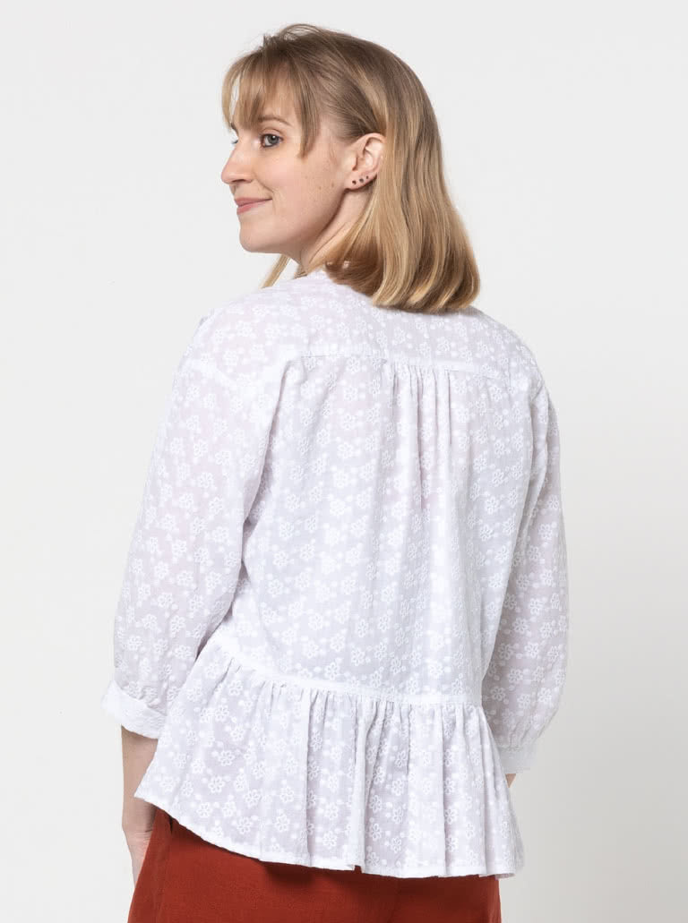 This cleverly drafted pattern has a front dolman sleeve and a set-in sleeve at the back. The masculine button-through front is off-set by the slight gathers that fall from the front neck and back yoke. This design features a 3/4 length sleeve and a gathered peplum skirt that creates an easy boxy silhouette.