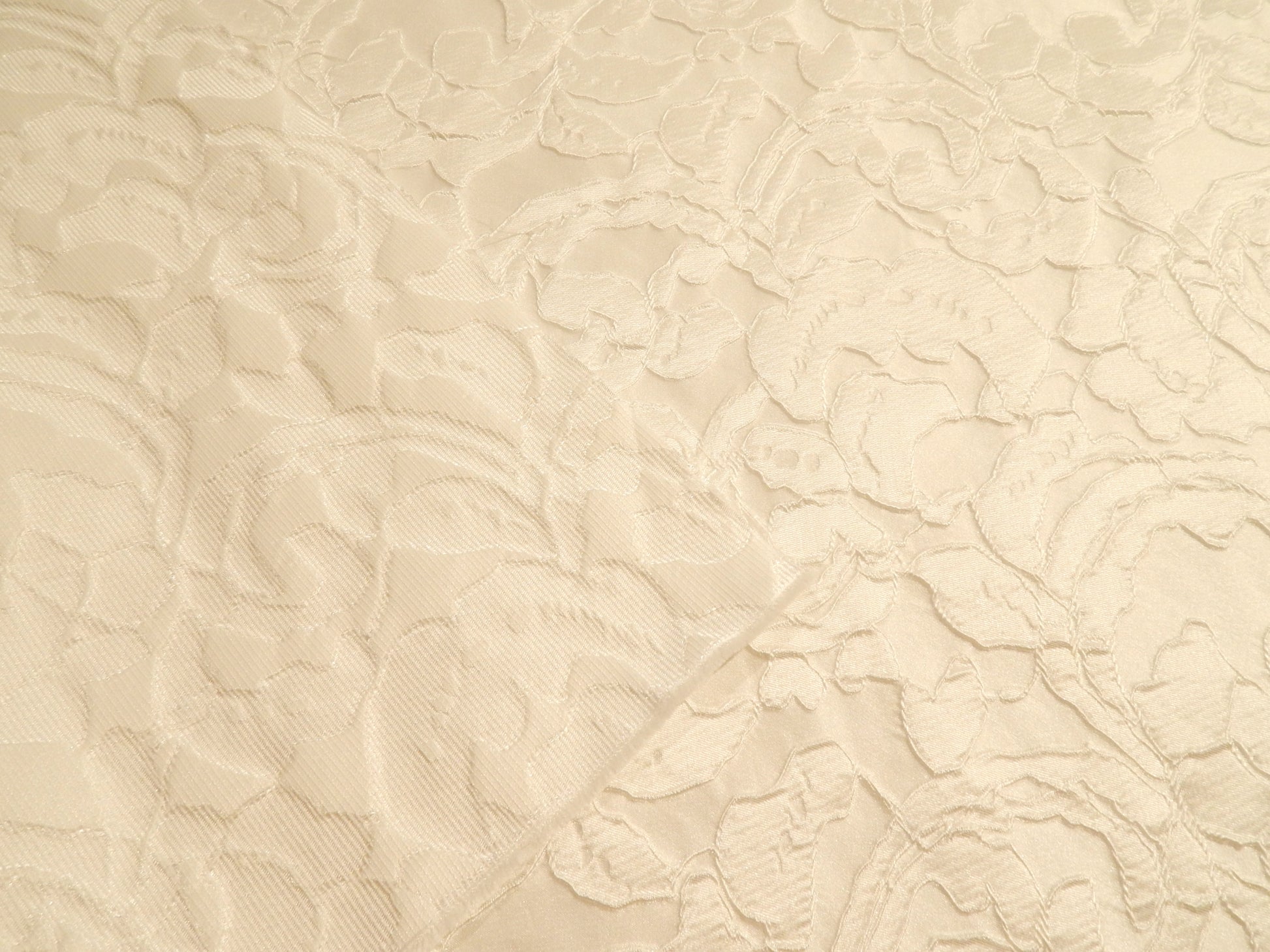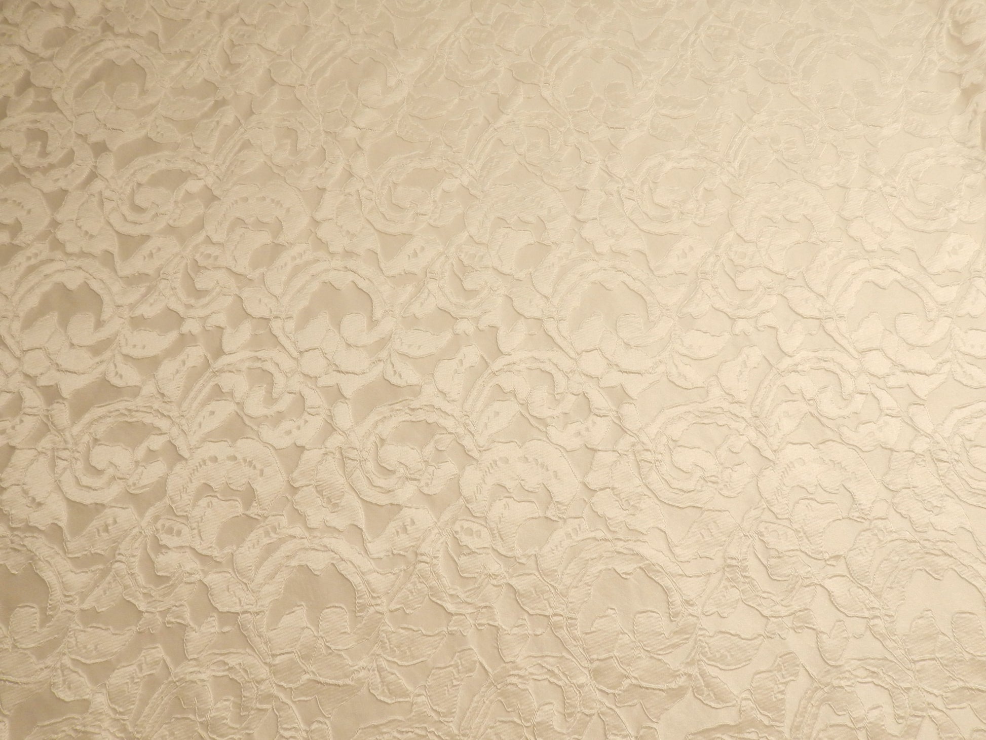 Use this understated Bridal White Raised Jacquard for your wedding dress! This fabric has a nice stiff hand to it which will help it to make a good looking fitted bodice as well as create a full skirt. The jacquard motifs are slightly raised giving it more texture and the ability to hide any unsightly body bumps. This fabric is not see through or reversible Use it for a simple and elegant wedding jacket, a wedding dress, or flower girl outfit!
