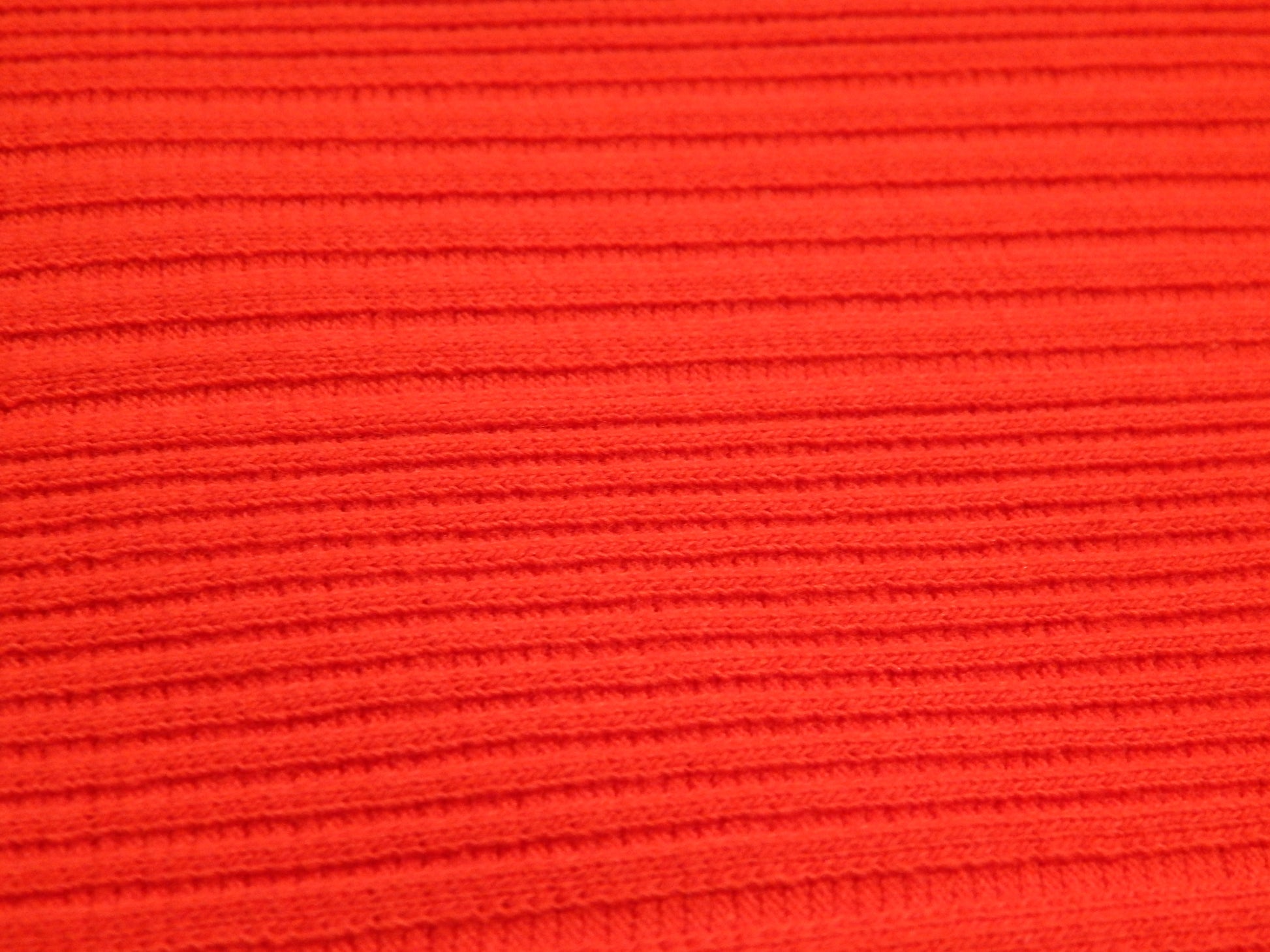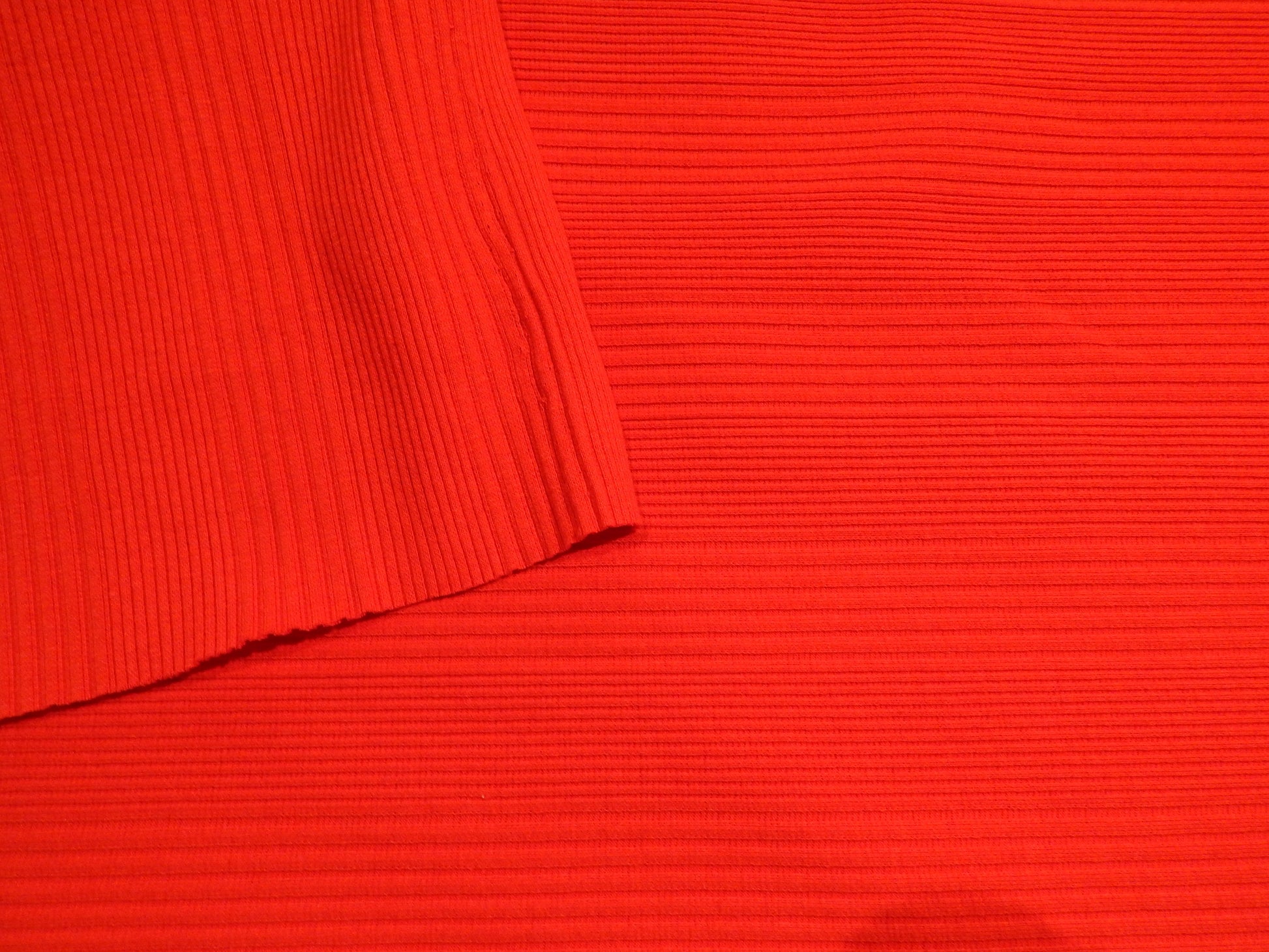 This Bright Red Variegated Rib Knit is such a fun take on the classic ribbed knit. It oscillates between a narrow and a thick rib, giving it added texture and interest. It has great elasticity and the ribs run along the selvage. It is mostly a 2-way stretch going widthwise, with just a little bit of give going along the selvage. The ribbed knit helps to create a tighter band around necklines, hems, and cuffs to keep the garment fitting tight, and this could also be used in dresses, tank tops, and body con skirts.