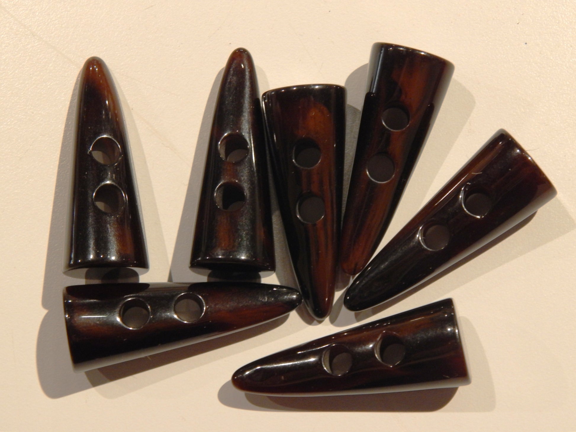 These superb Dark Brown Polished Toggle are wonderful for fall and winter capes, or your next historical or fantasy based cloak. The dark brown is slightly marbled between black and brown and becomes brighter when placed on lighter colored fabrics.
