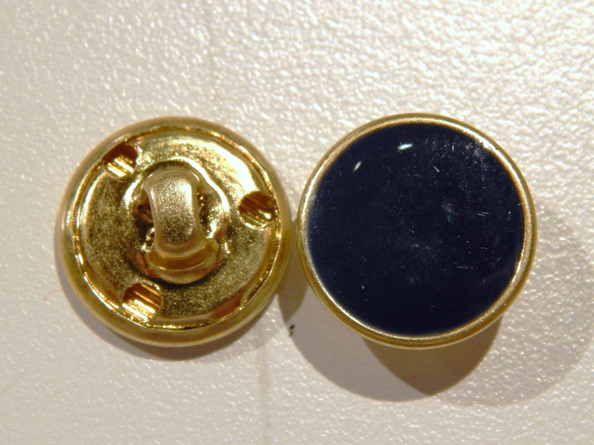As make a statement with these Glossy Navy Gold Rimmed Buttons. Their shiny surface is a deep blue that can nearly look black. They are made out of metal and resin and are pretty lightweight but would still do well on a fabric thick enough for them to stand up straight. They would be perfect on a blazer, high end men's jacket, or a spiffy vest.