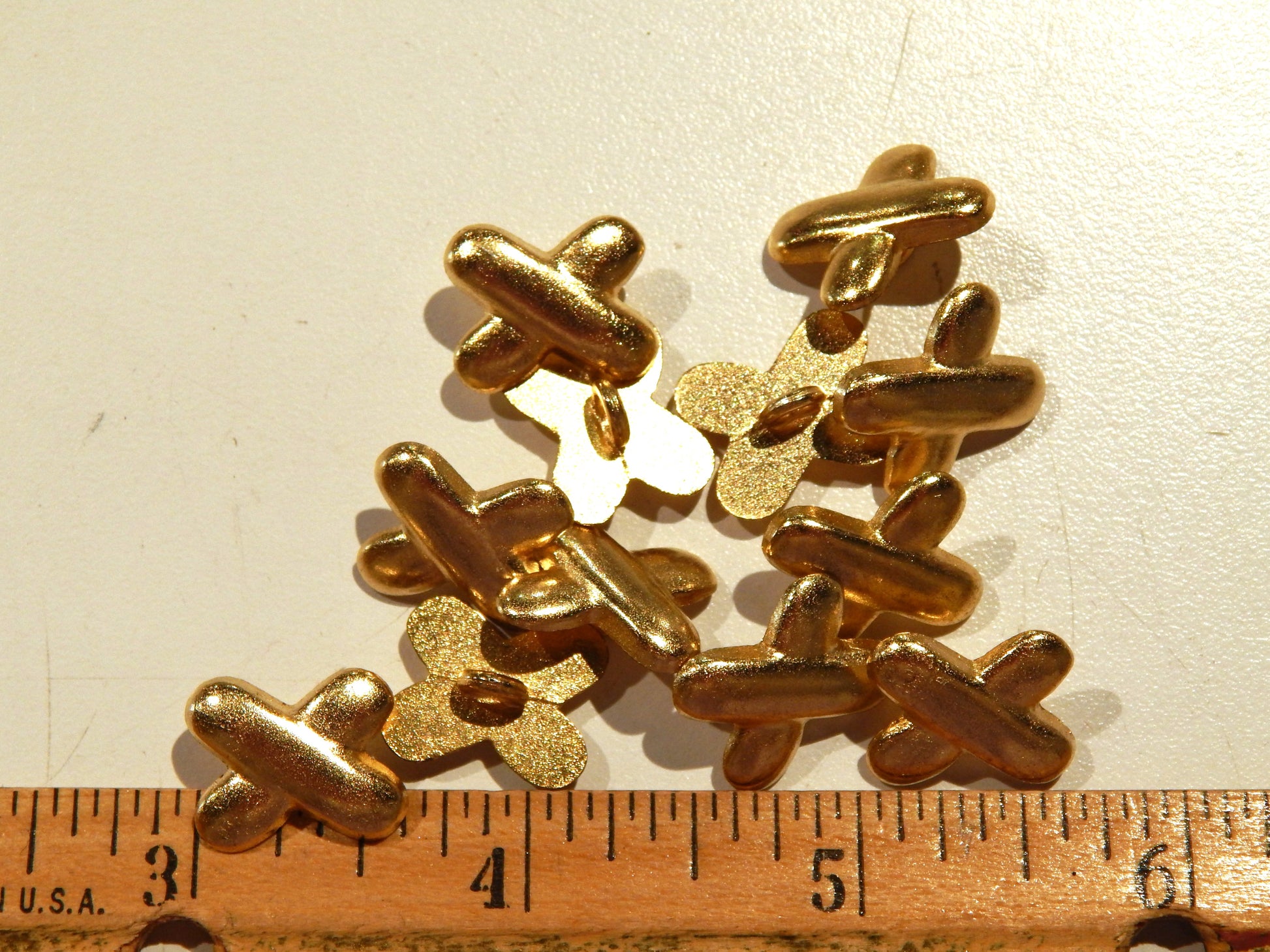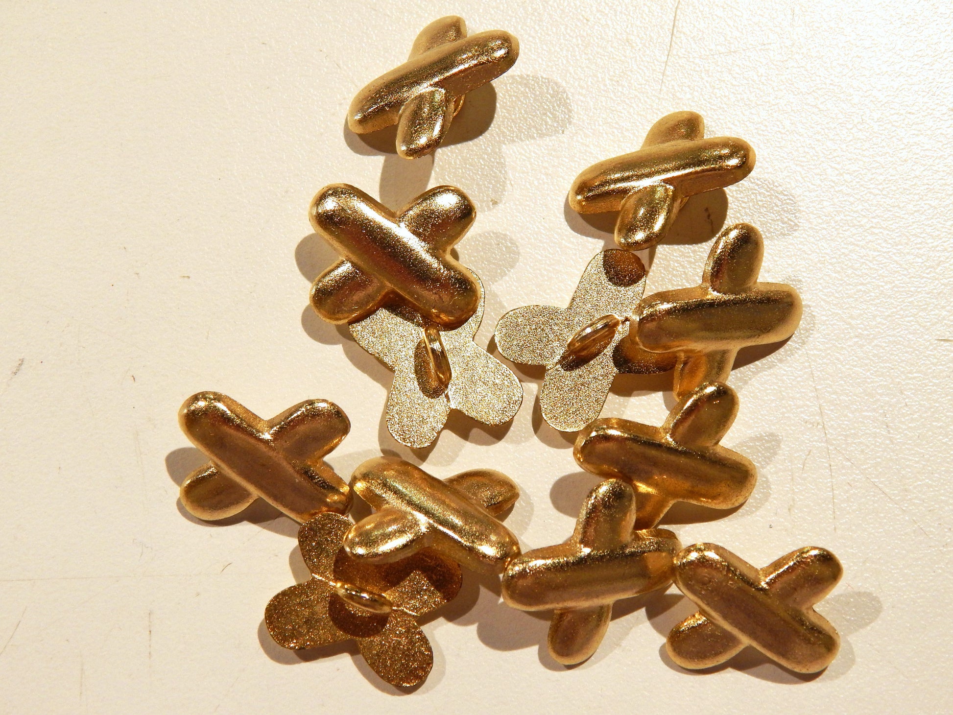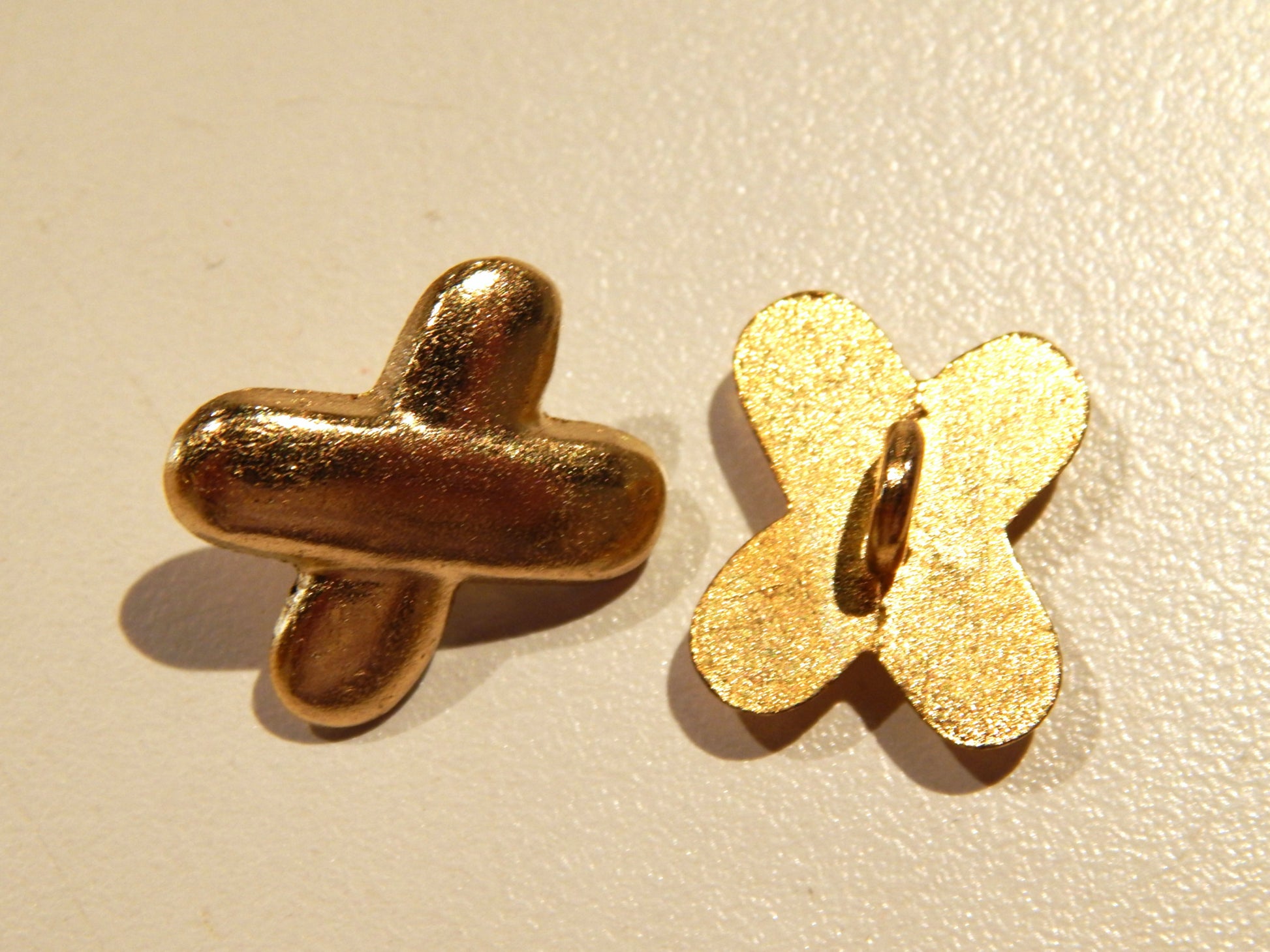 As make a statement with these Gold X buttons. Their shape is very unique, and reminds you of some hand sewing stitches. The gold is vibrant, yet matte, and sits well over fabric. They are made out of metal so they are a little weighty and would do best on a fabric that could support them. They would be perfect on a blazer, high end men's jacket, or a spiffy vest.
