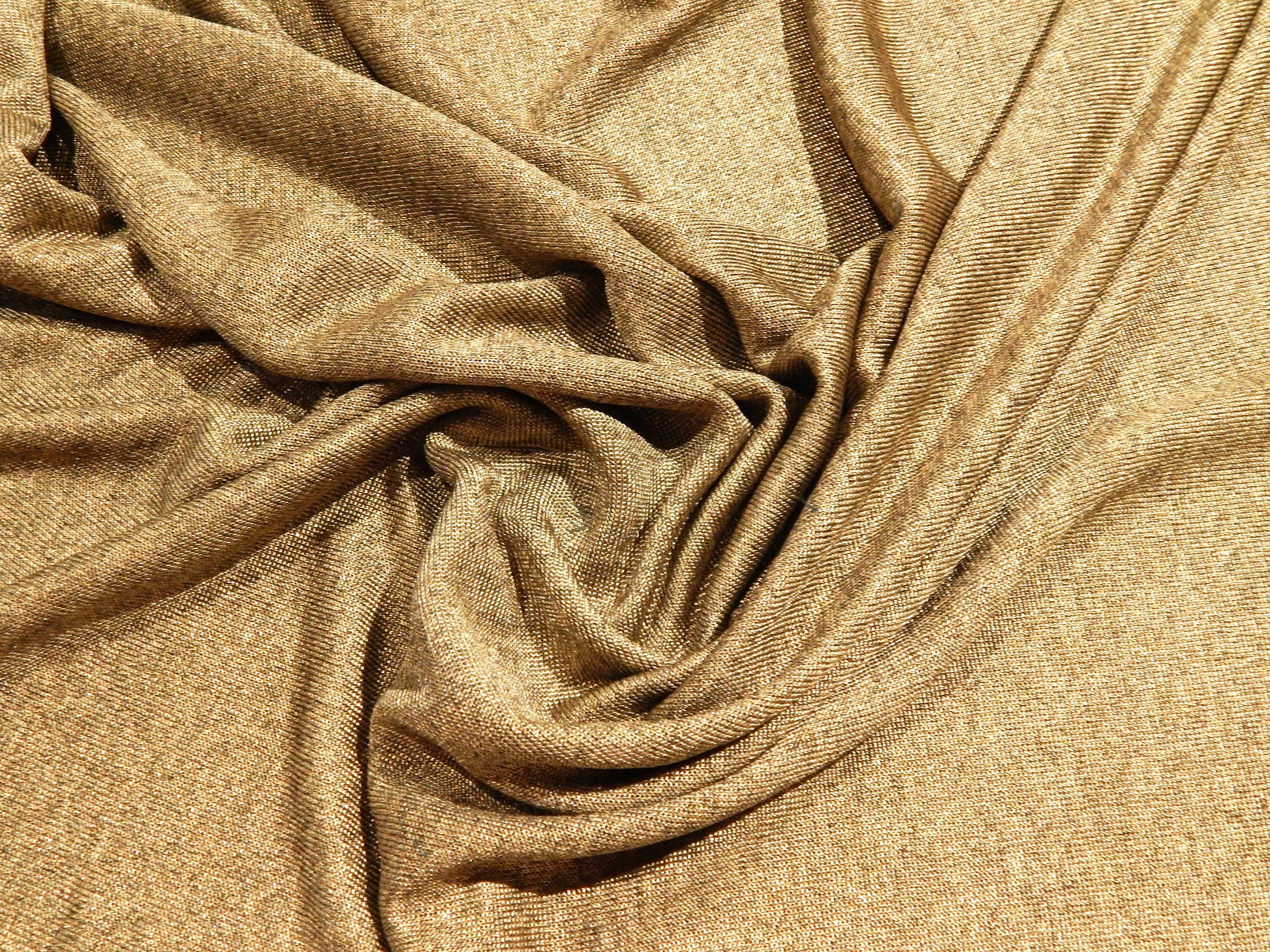 This gorgeous Grey Gold Metallic Knit fabric is stretchy, flashy, and absolutely begging to be your next formal gown. It drapes well, is a nice, soft, muted gold, and is not see through unless stretched to it's full capacity. Use this for a fun holiday outfit, a formal dress, or accent fabric for a costume!