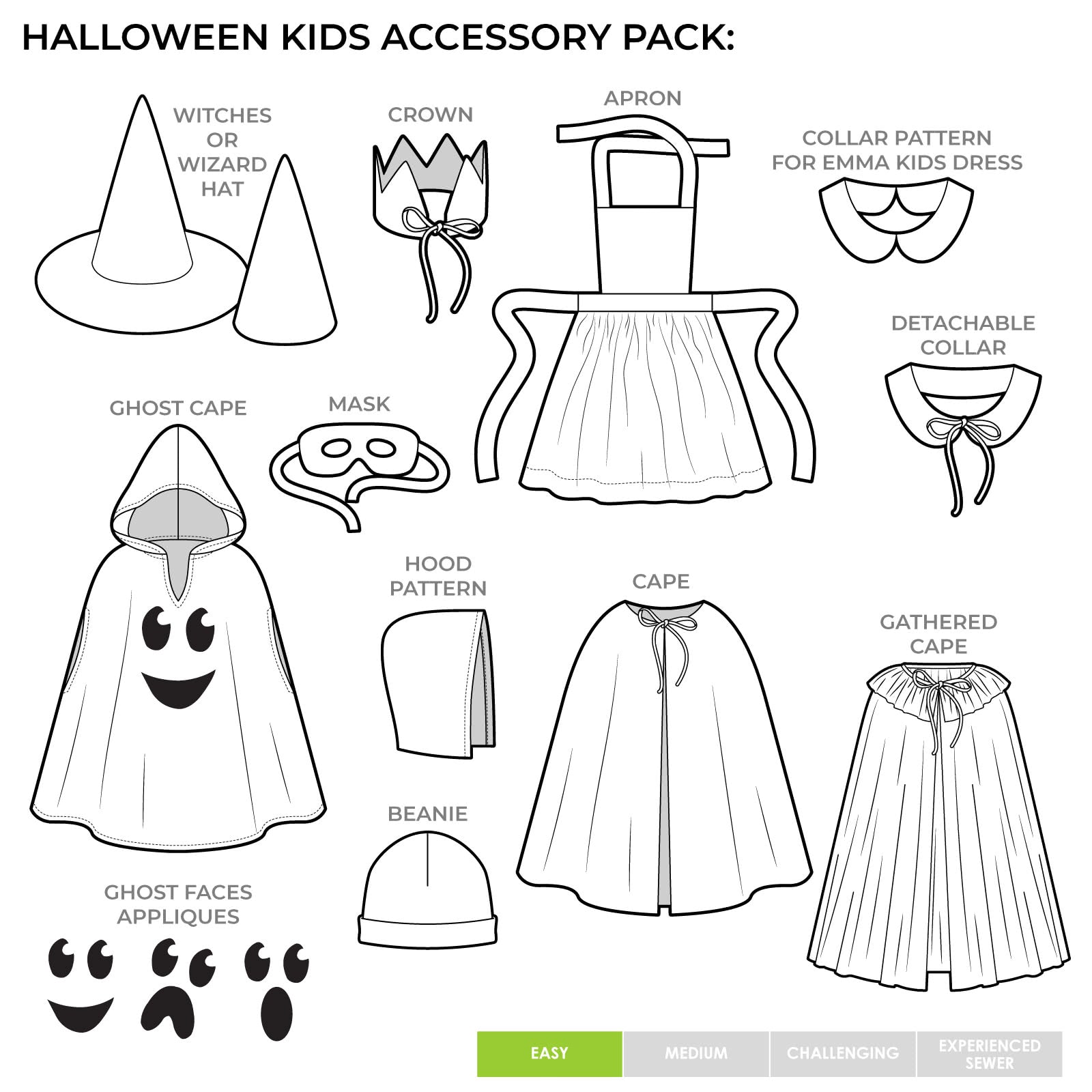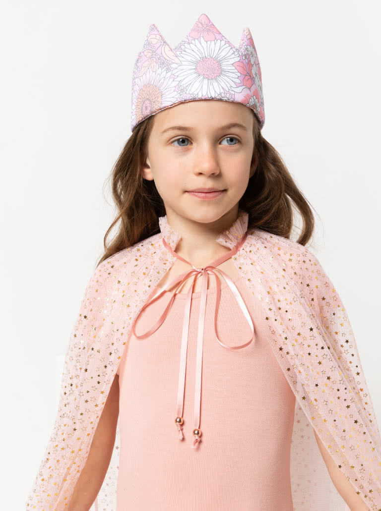 Cape, hood, witches’ hat, apron, crown, beanie, Peter Pan collar, and eye mask.