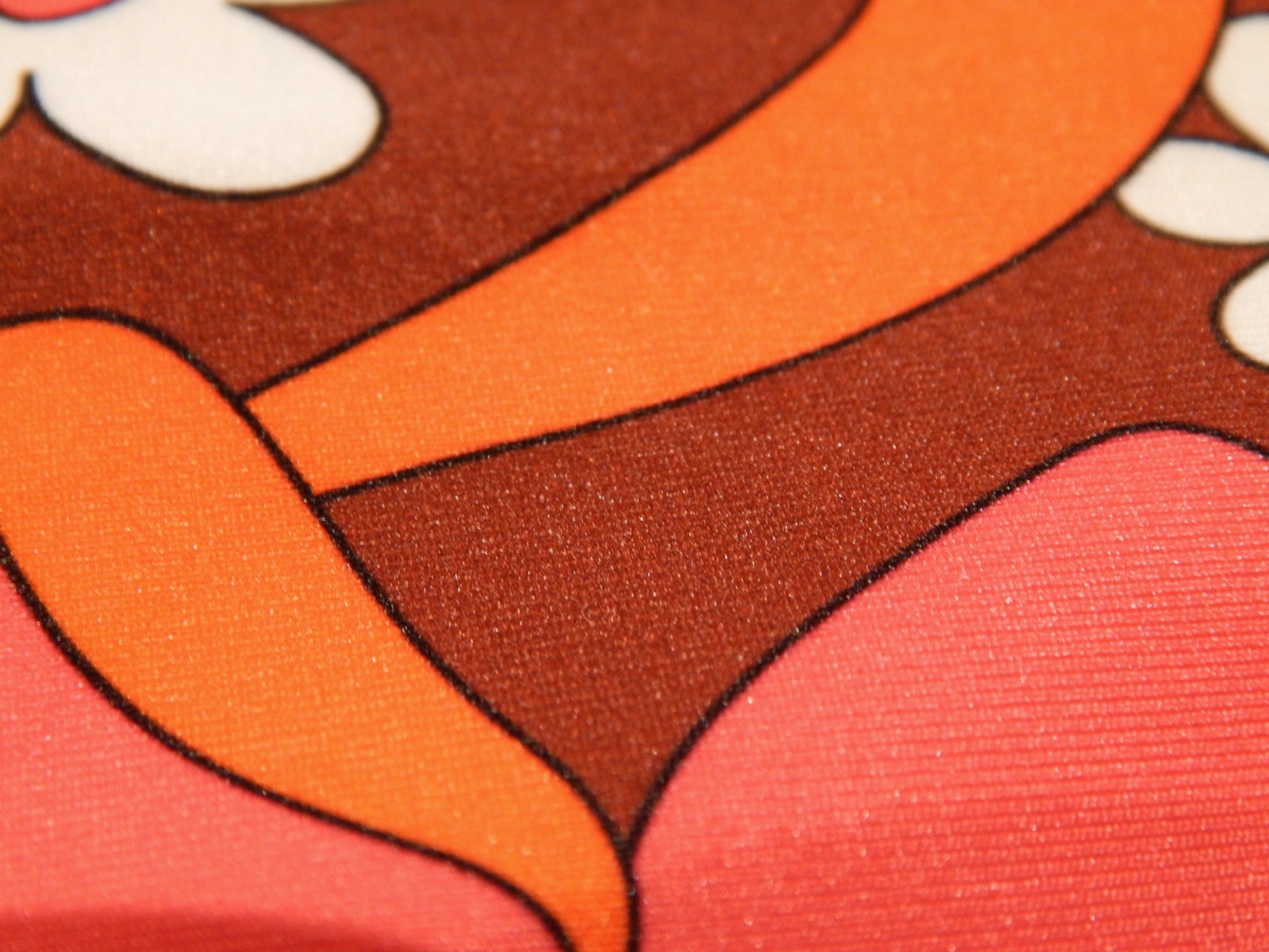 This spunky Italian Retro Floral Swimwear Knit fabric is perfect for all sorts of sportswear applications. It has 4-way stretch for the most comfort while swimming or working out, a high degree of elasticity for tight compression, and water (sweat) wicking properties. Polyamide (nylon) is naturally SPF proof so this will help to block the UV rays making it also great for rash guards. Plus this fun print would be so cute on some mommy and me matching swim sets. This fabric would make a wonderful pair of leggings, a swimsuit, sports bra, or biker shorts!