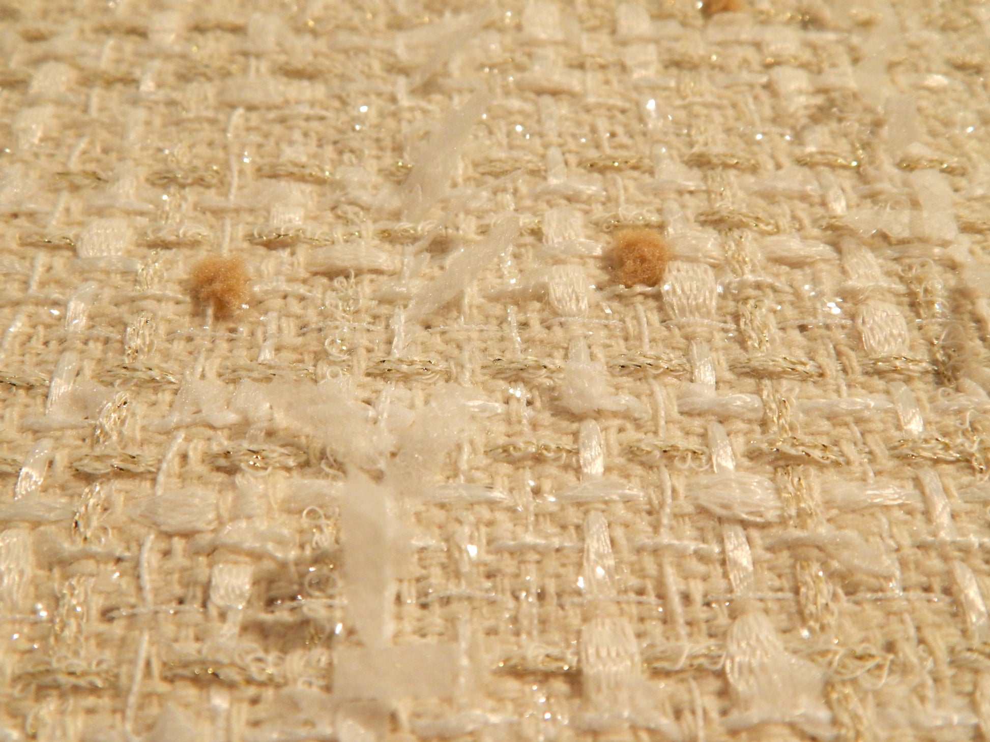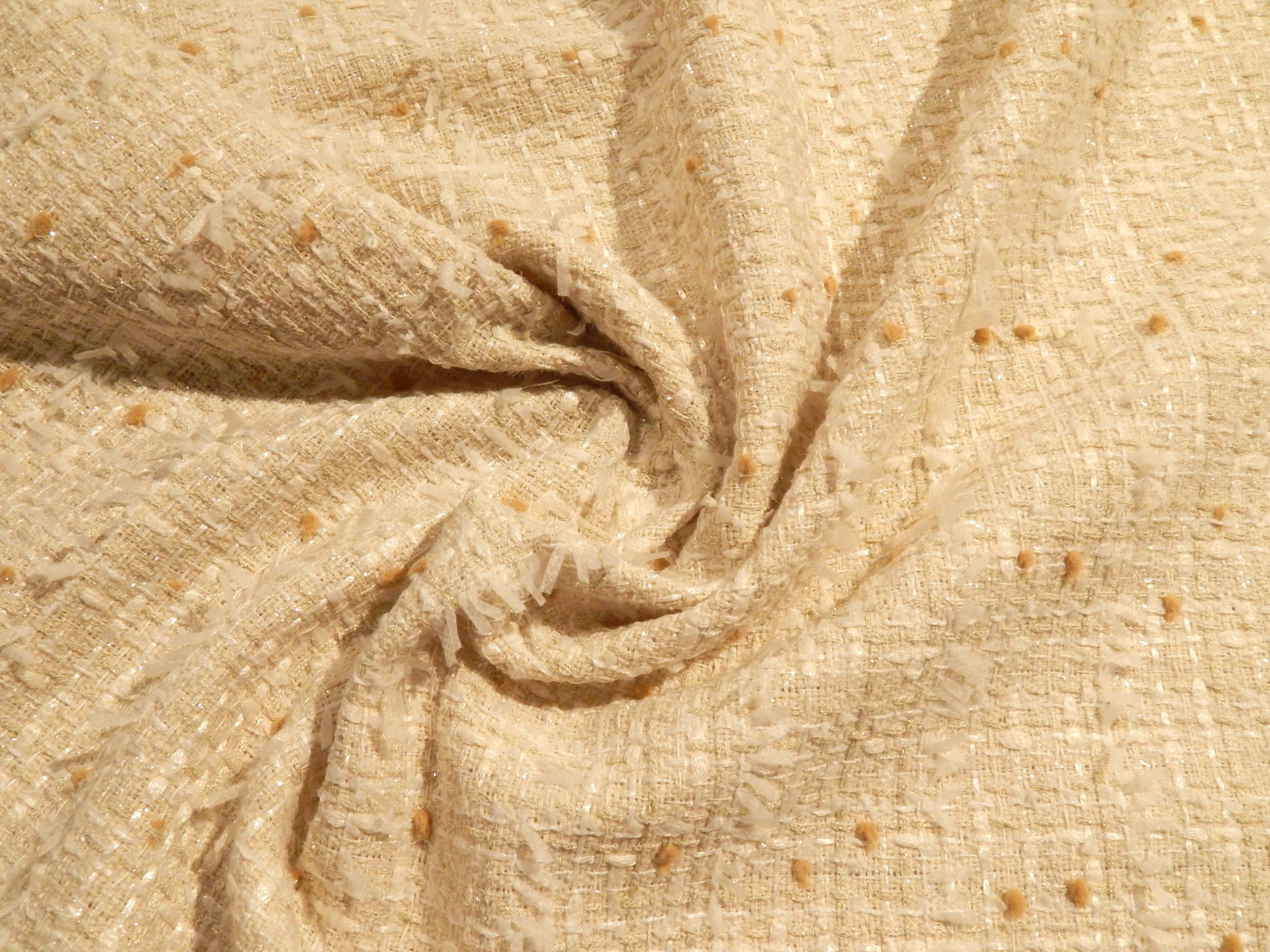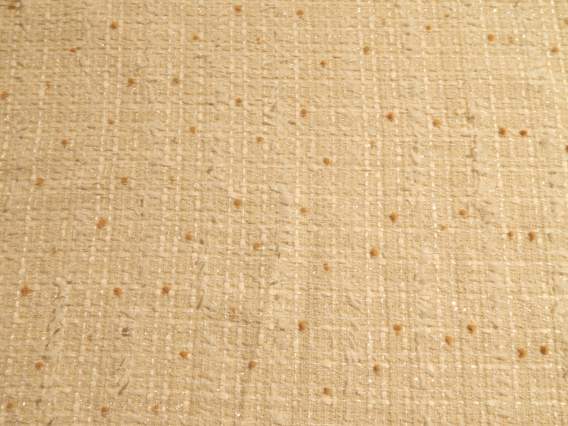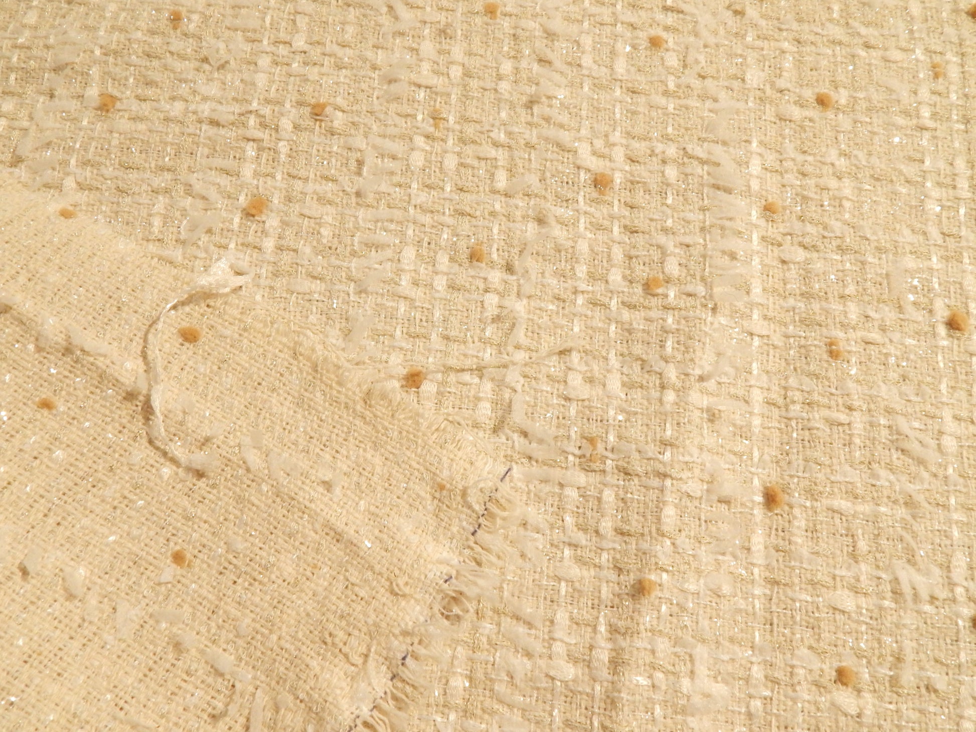 This Ivory Barbie Tweed has such a beautiful texture and is a beautiful winter formal fabric. It is a midweight fabric that has been woven with interesting yarns that give it a fringe like texture and speckle it with dots of golden brown. Since it is a looser weave it would do best to be quilted to a lining or underlining to keep it from running, just like Chanel jackets are. Use this fabric for a fun new jacket like the Style Arc Delphine, mini skirt, or even handbag.