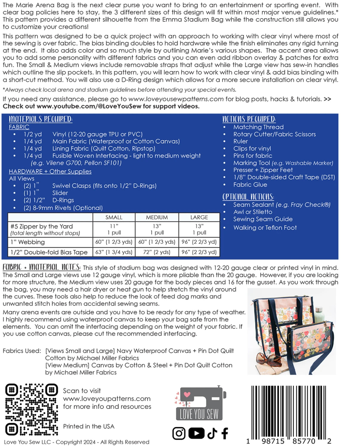 "The Marie Arena Bag is the next clear purse you want to bring to an entertainment or sporting event. With clear bag policies here to stay, the 3 different sizes of this design will fit within most major venue guidelines. This pattern provides a different silhouette from the Emma Stadium Bag while the construction still allows you to customize your creations! This pattern was designed to be a quick project with an approach to working with clear vinyl where most of the sewing is over fabric. The bias binding doubles to hold hardware while the finish eliminates any rigid turning at the end. It also adds color and so much style by outlining Marie’s various shapes. The accent area allows you to add some personality with different fabrics and you can even add ribbon overlay & patches for extra fun. The Small & Medium views include removable straps that adjust while the Large view has sew-in handles which outline the slip pockets.