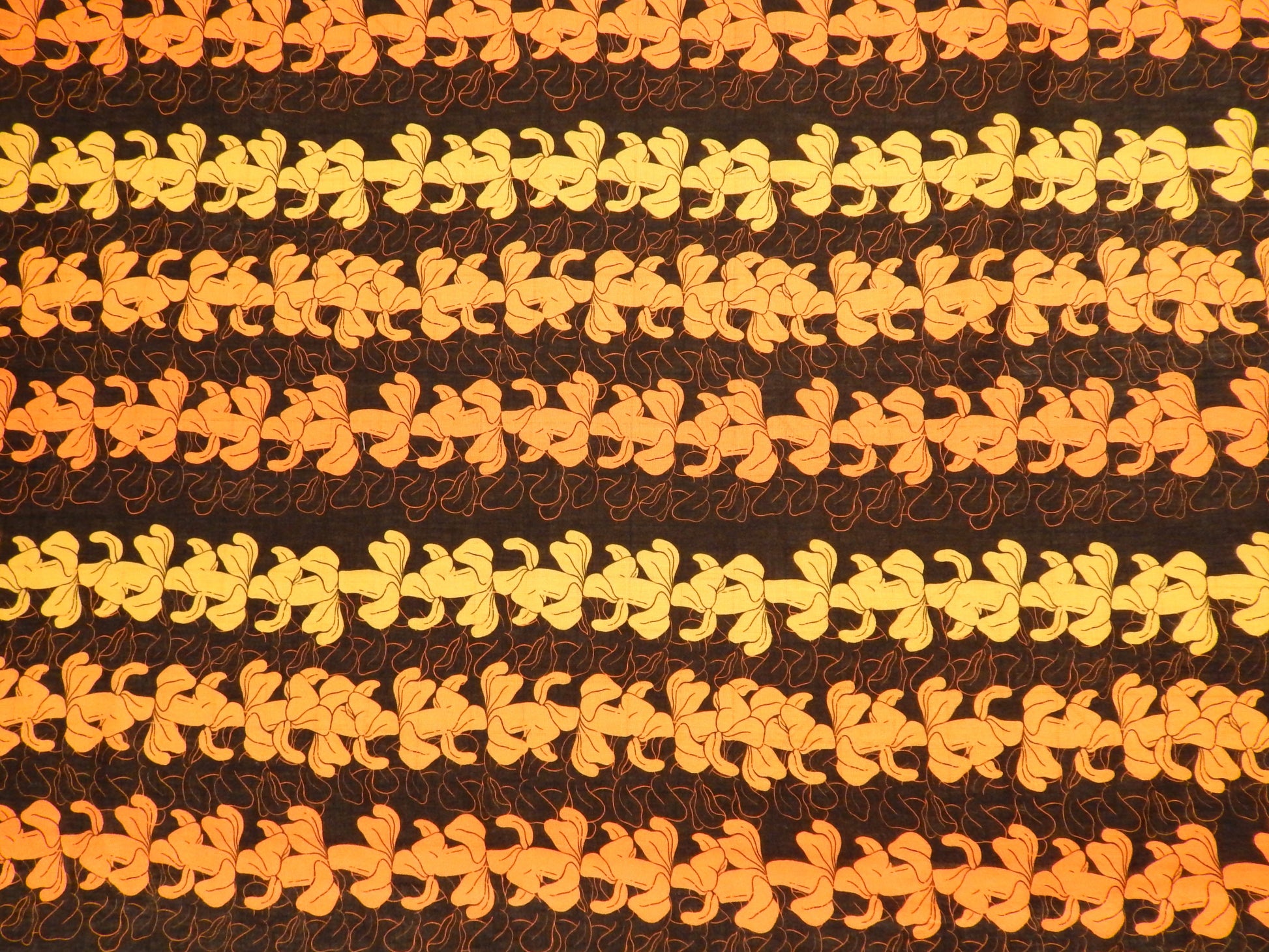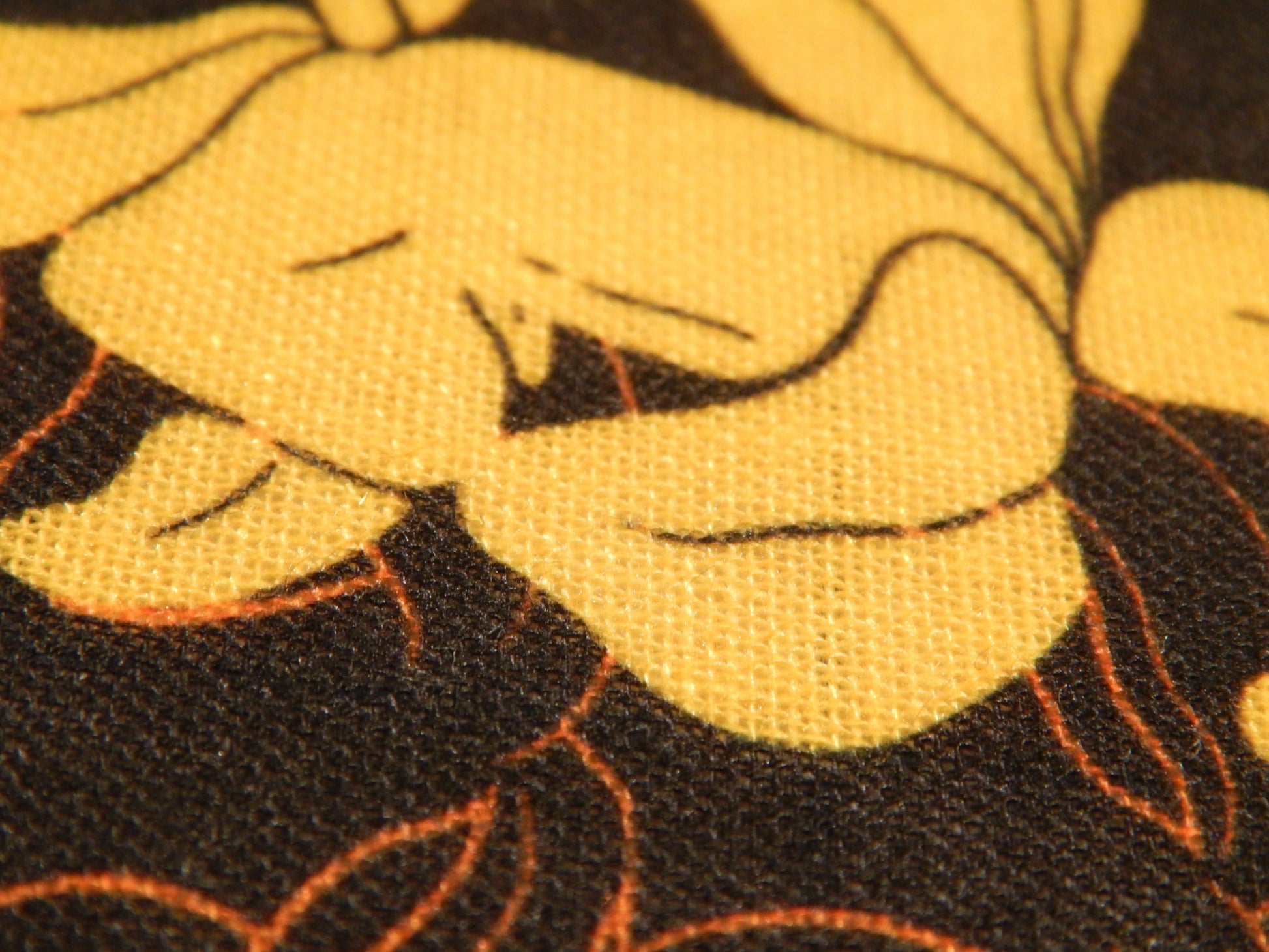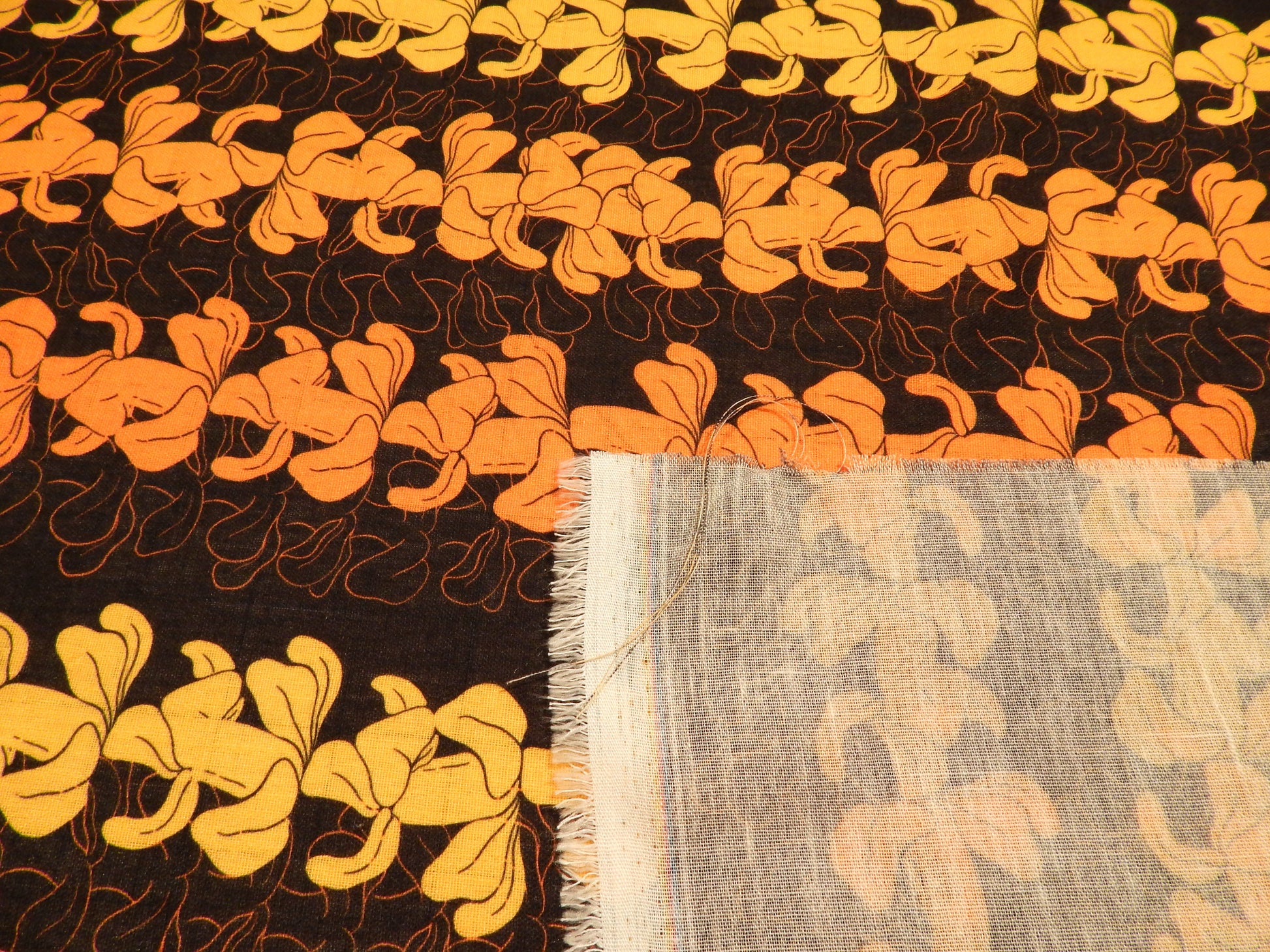 This Mod Yellow and Orange Bold Leaf Print Linen is so wild and loud. The yellow, gold, and orange colored peeled banana looking motifs contrast nicely with the dark brown background. The pattern creates a stylized type of stripe that runs along with the selvage. This has a nice lineny texture from the slubs and is a mid-lightweight fabric. This would work well for some home dec pillows, some outrageous pants, or even as a tiered dress!