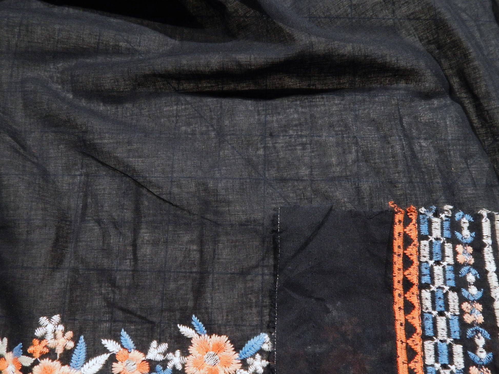 Navy and Coral Embroidered Floral Scalloped Cotton Lawn