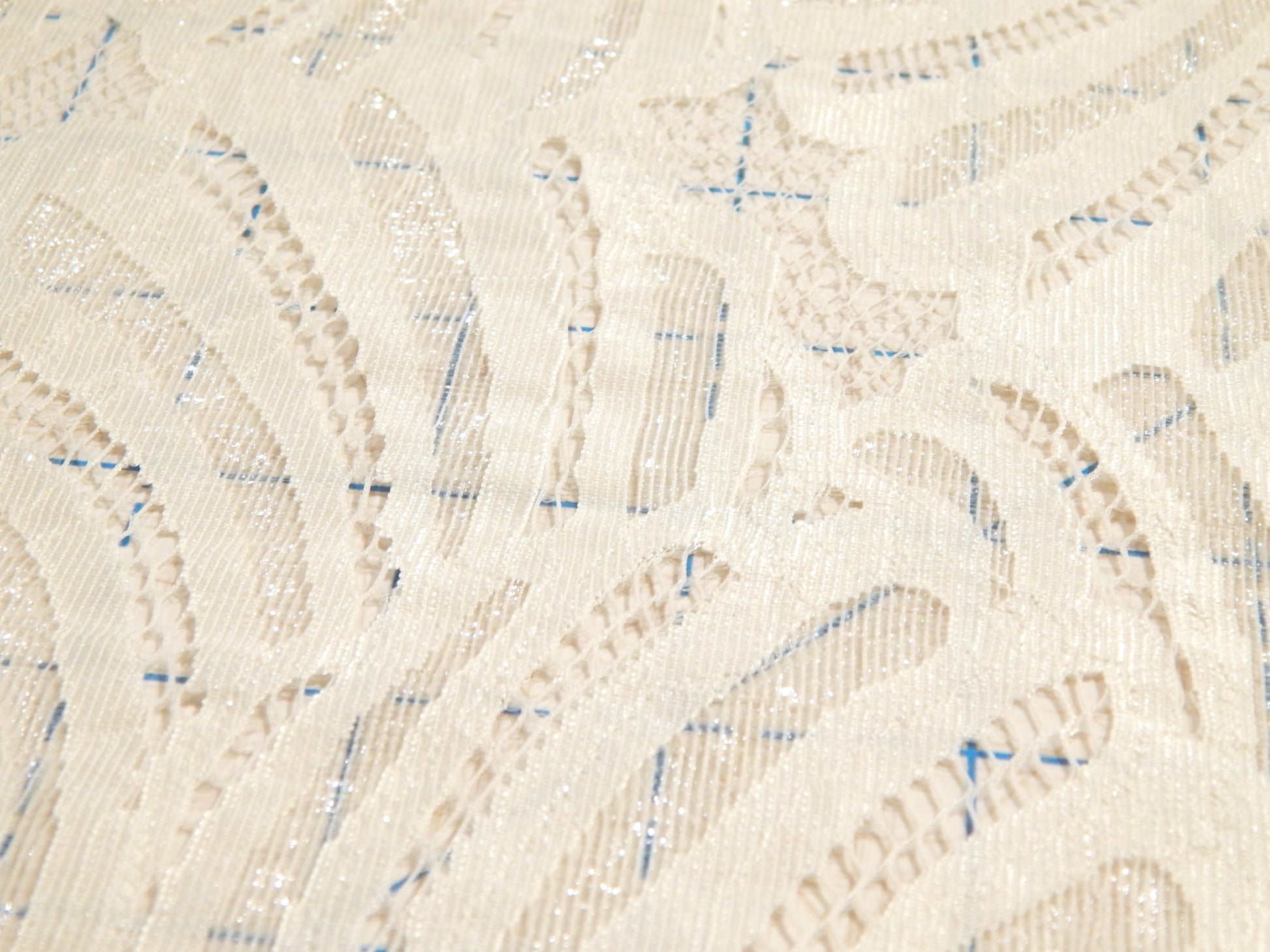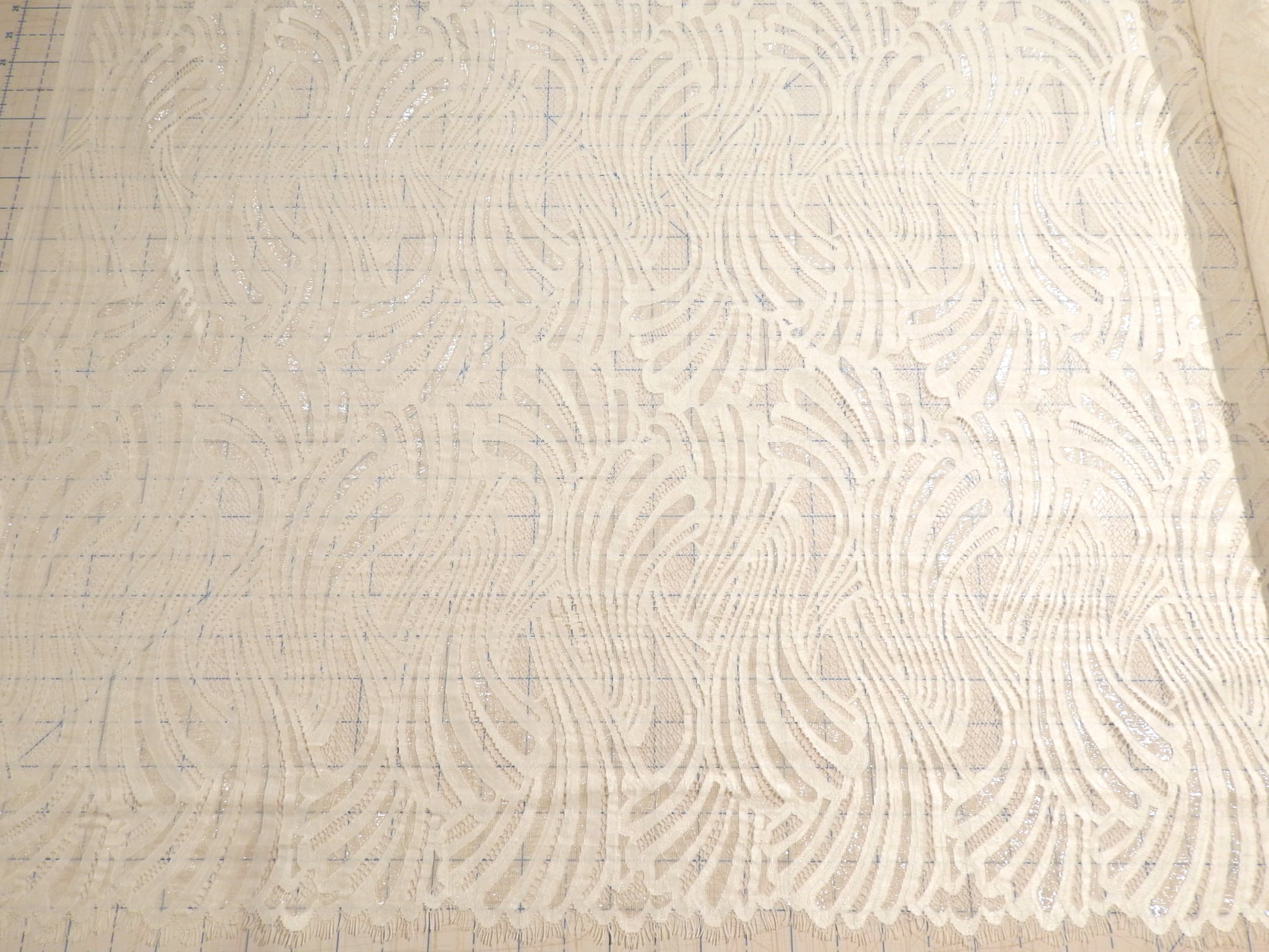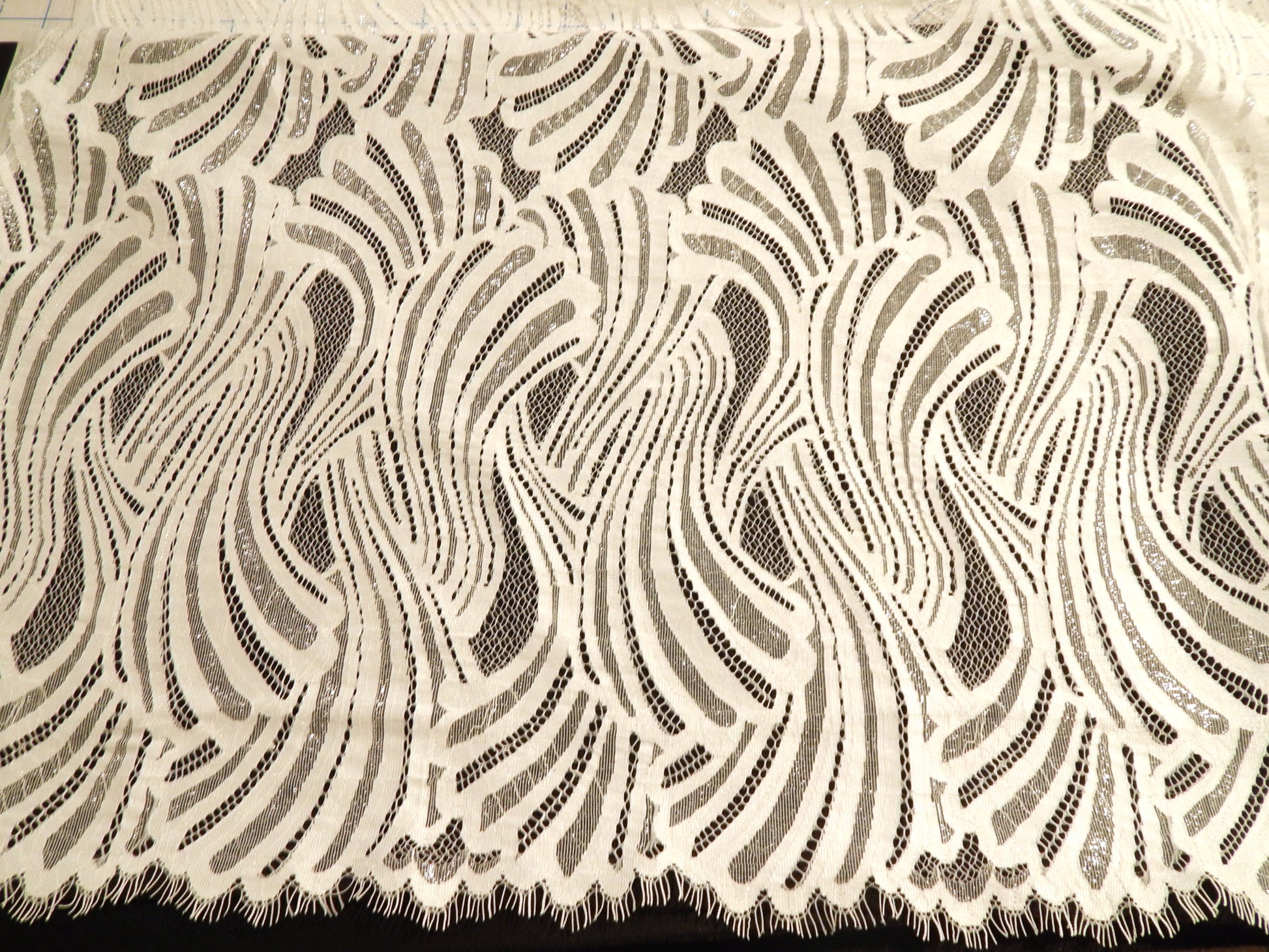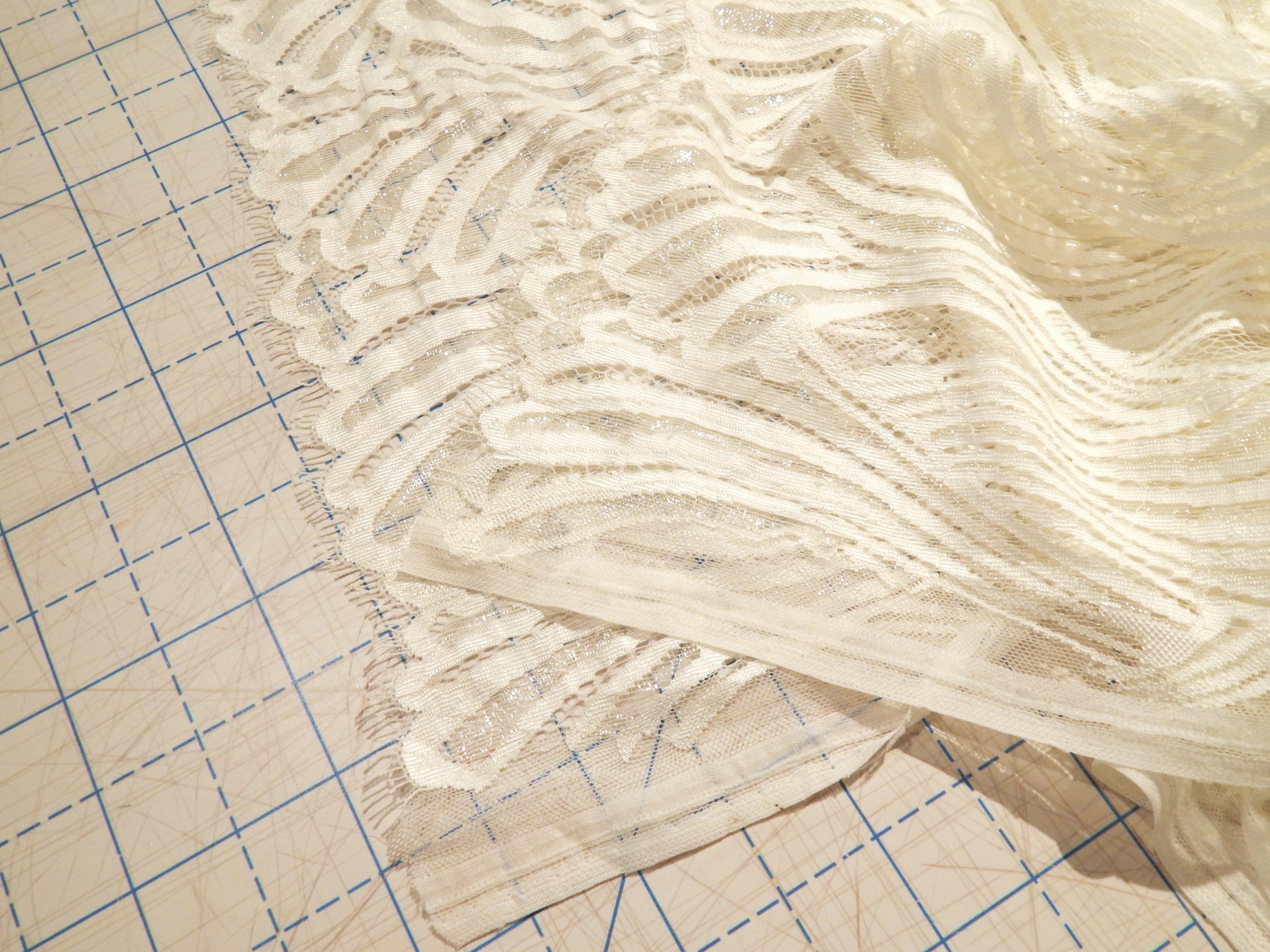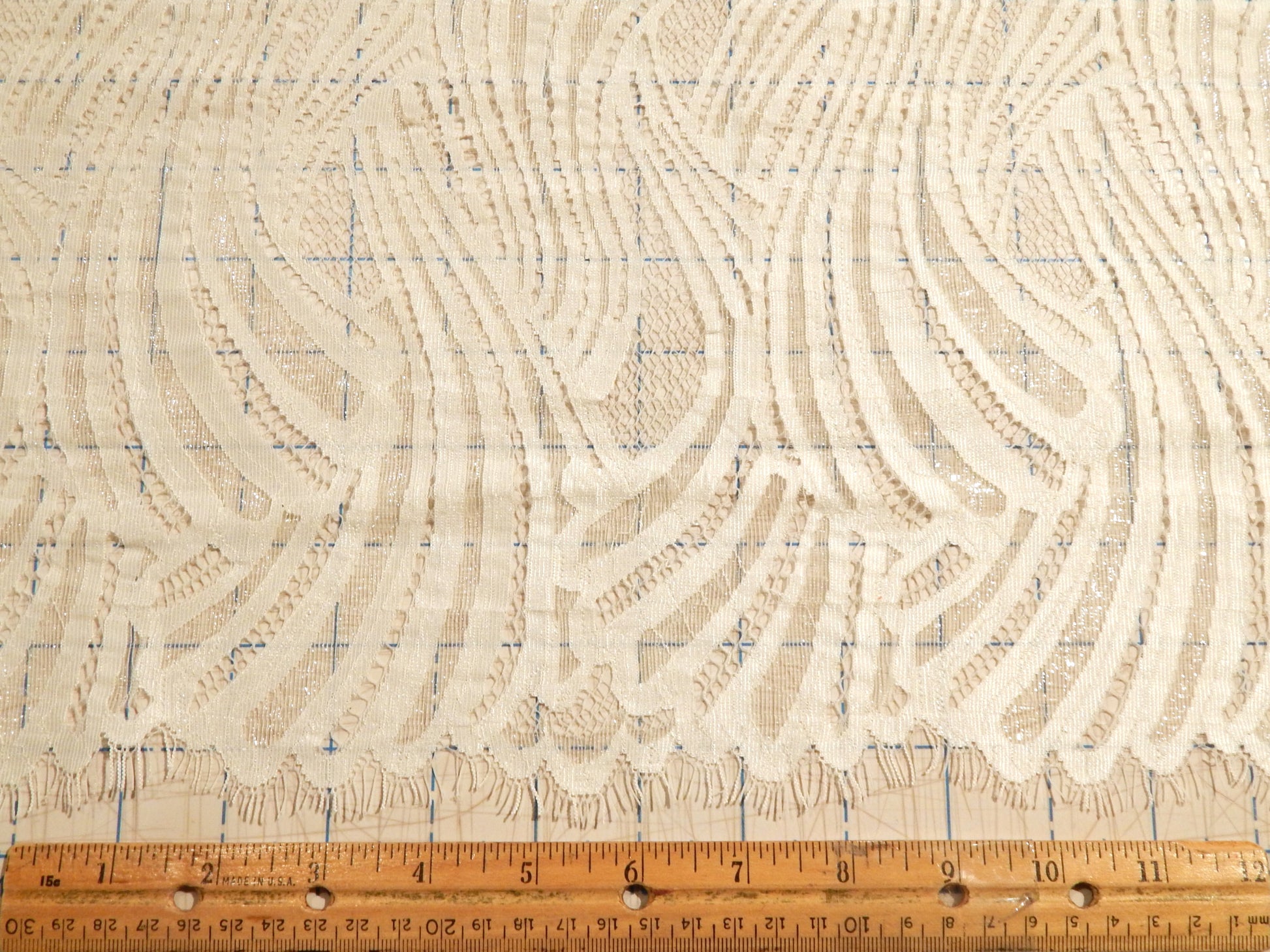 This stunning Pascal Ivory Lace has a feathery and angelic feel to it. Both edges are scalloped and eyelashed, and the whole fabric has mylar woven into it to give it some shine. This lace comes in a panel that is three yards long. They are prewoven and cut into this increment, so the price is for one three-yard piece. Use this for a wedding dress, first communion skirt, or some lingerie!