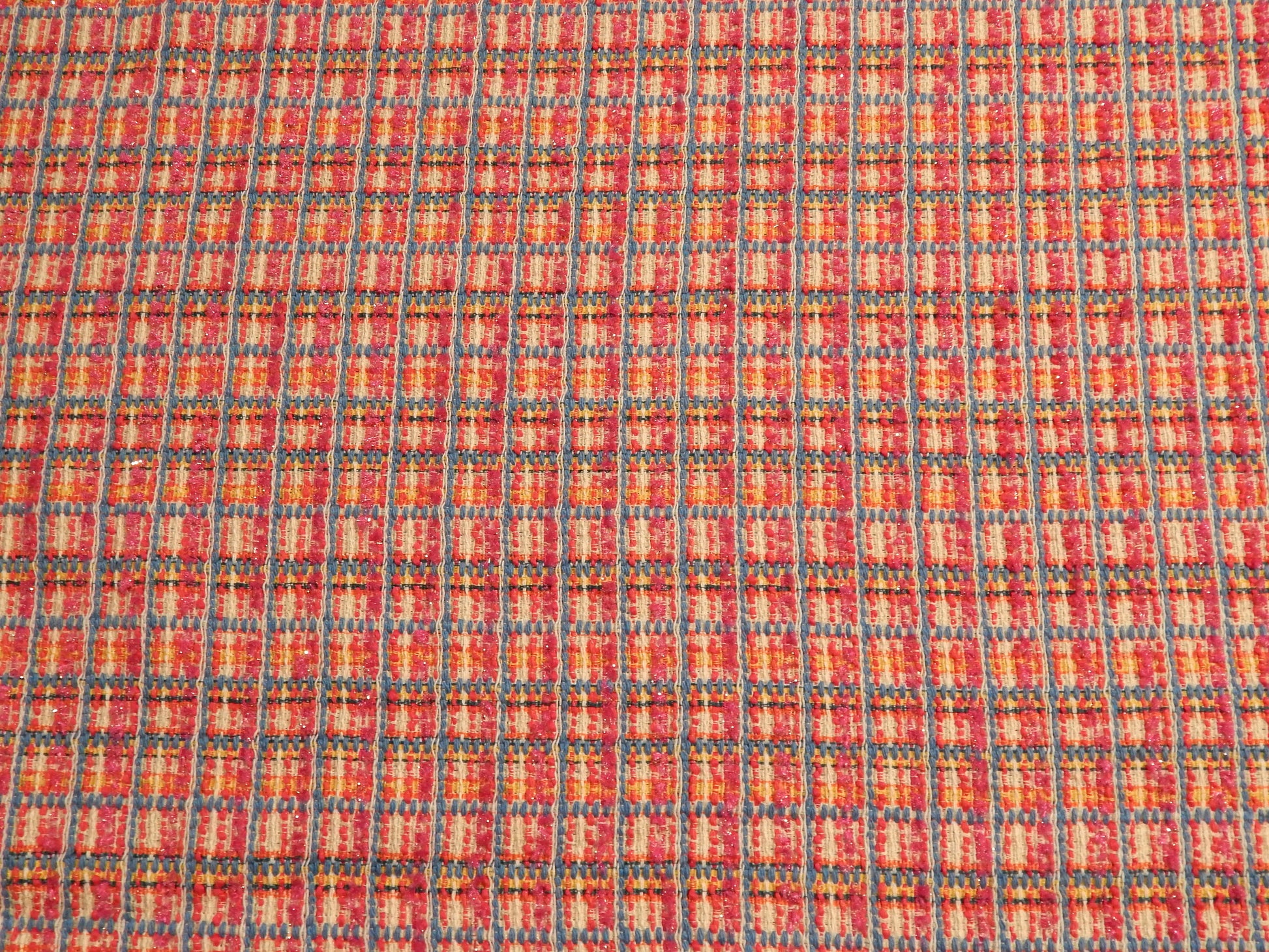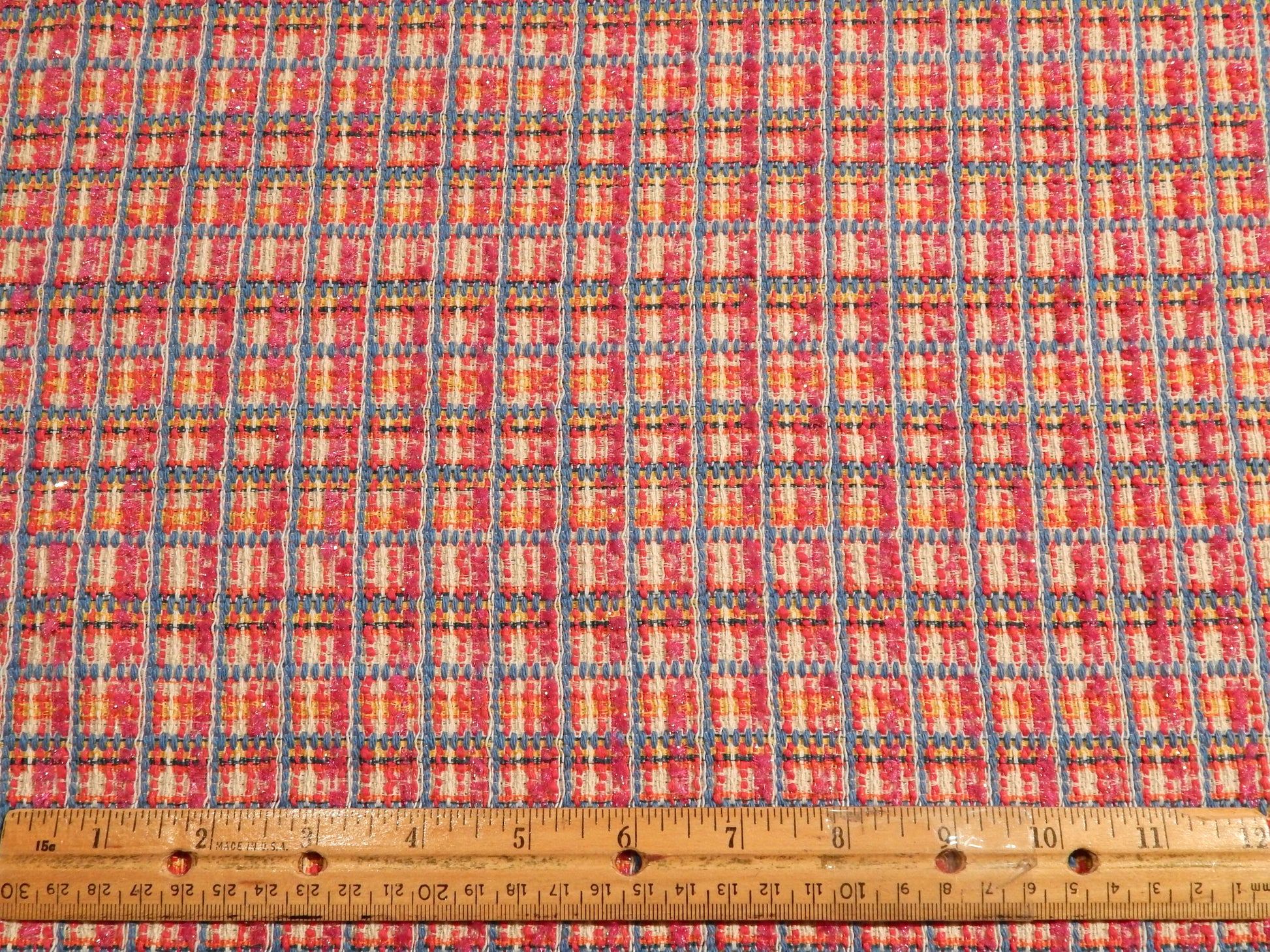 This Pink Pop Plaid Tweed Fabric is a feast for the eyes. The various colors of yarns used in it's weaving contrast so brightly and give the fabric wonderful depth. This fabric has a nice drape and good weight to it. While this fabric may technically not be reversible, we totally love the backside and think it would make a stunning unlined jackets. This fabric has a looser weave and will probably need to be lined, and possibly even slightly quilted to help hold it to the lining. Use this fabric for a fun new jacket, mini skirt, or even handbag.
