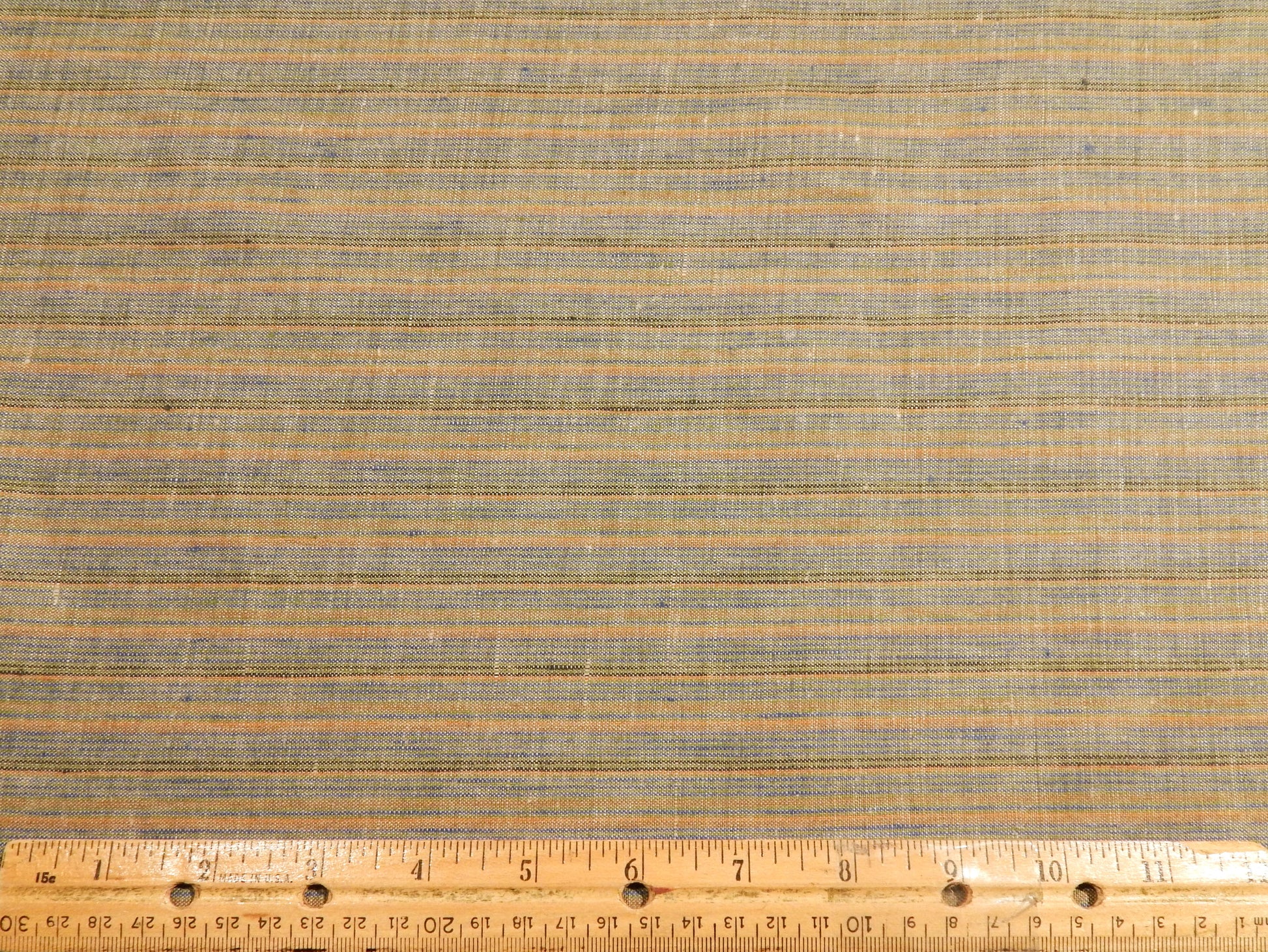 This unique Polish Green, Orange, Blue, and Tan Striped Linen is a very natural and muted blend of colors. The stripes on this fabric are very thin, and alternate in a less than 1 inch space. This makes them less bold which is great for designs where you want some interest and texture, but without the fabric being too overpowering. This fabric drapes decently well and is not see through. Use this in a men's summer button-up shirt, a vintage dress, or as some curtains!