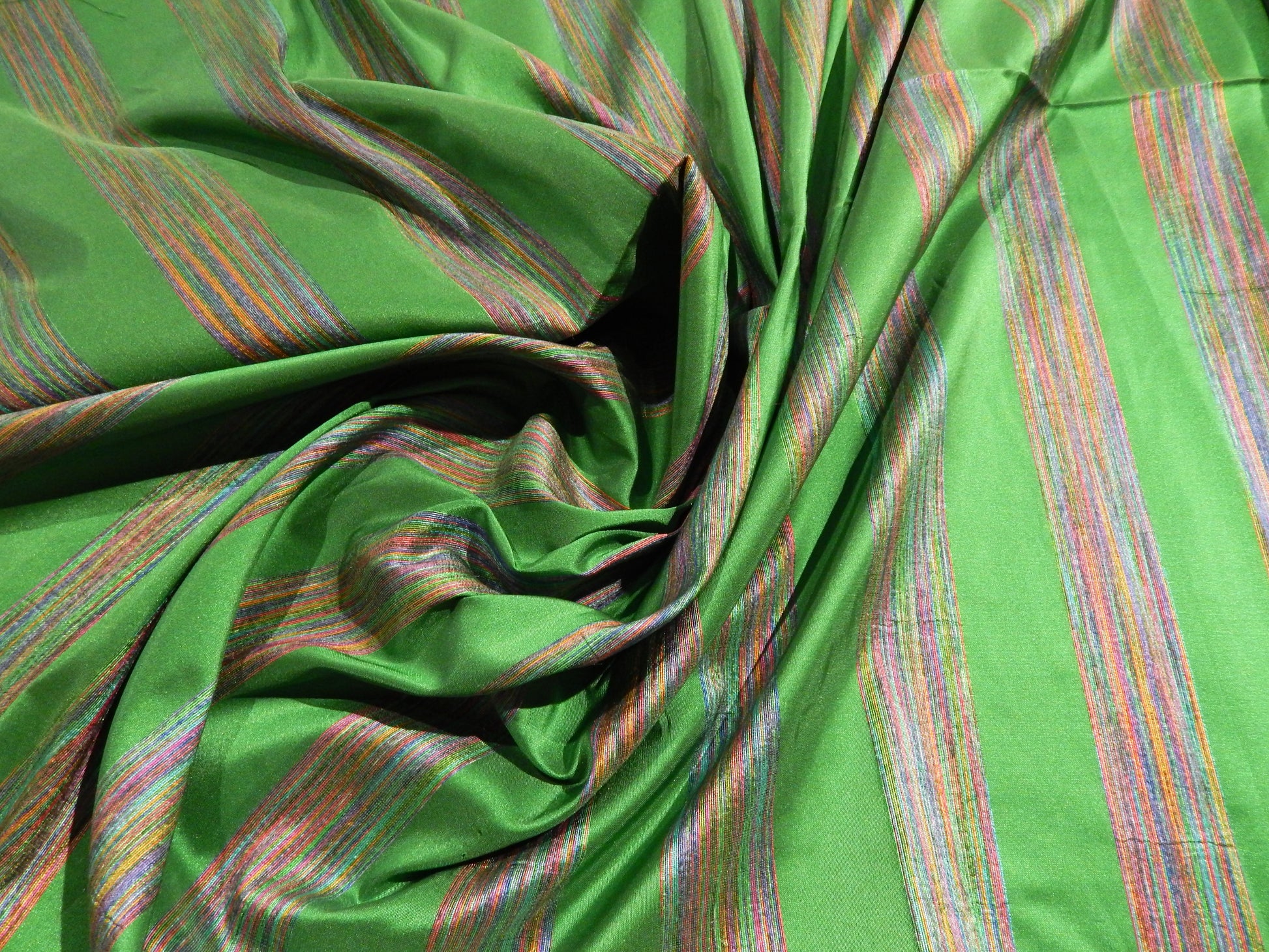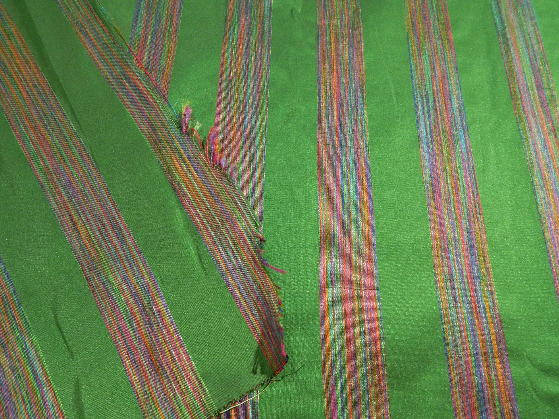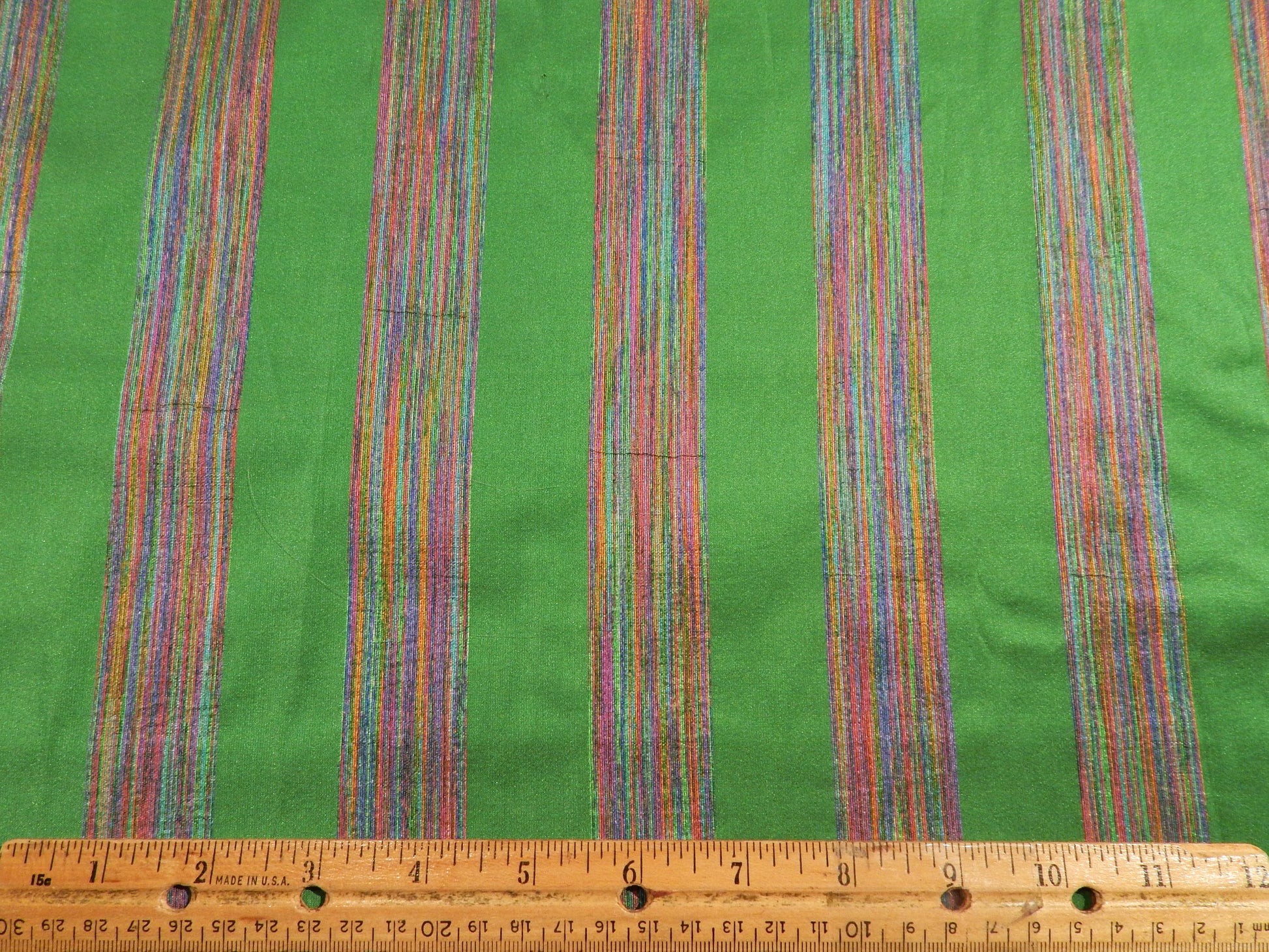 This stunning Rainbow Road Striped Green Silk is a bright green complemented by thick bands of a rainbow of colors. Interestingly, the striped portions of this fabric are slightly thicker than kelly green background. The closer you get, the more vivid the stripes become. This fabric has a crisp and stiff drape and is not see through at all. It has a great memory and will hold pleats and volume really well. Use this for a historical dress, a contrasting waistband, or gorgeous pleated gown!