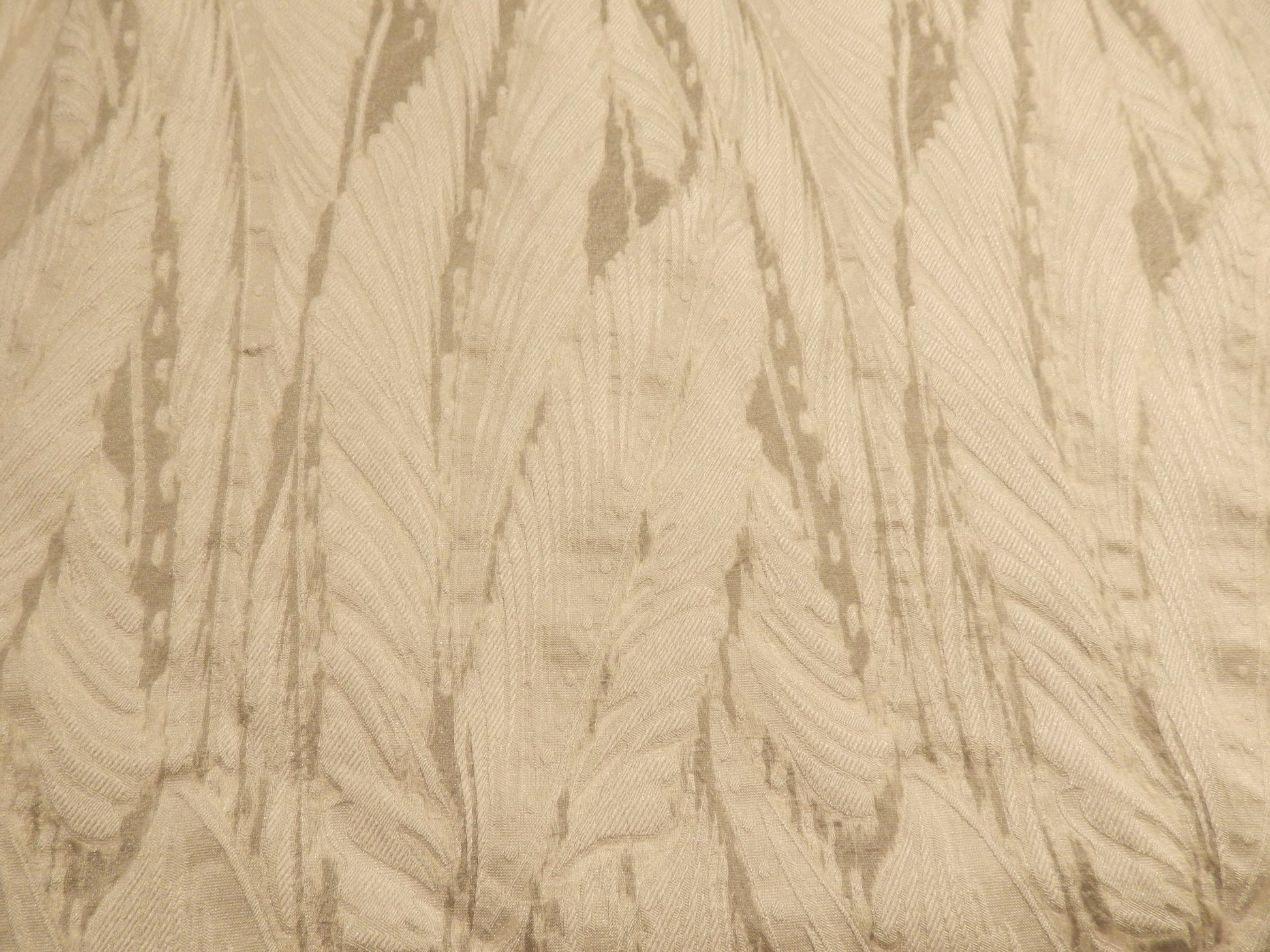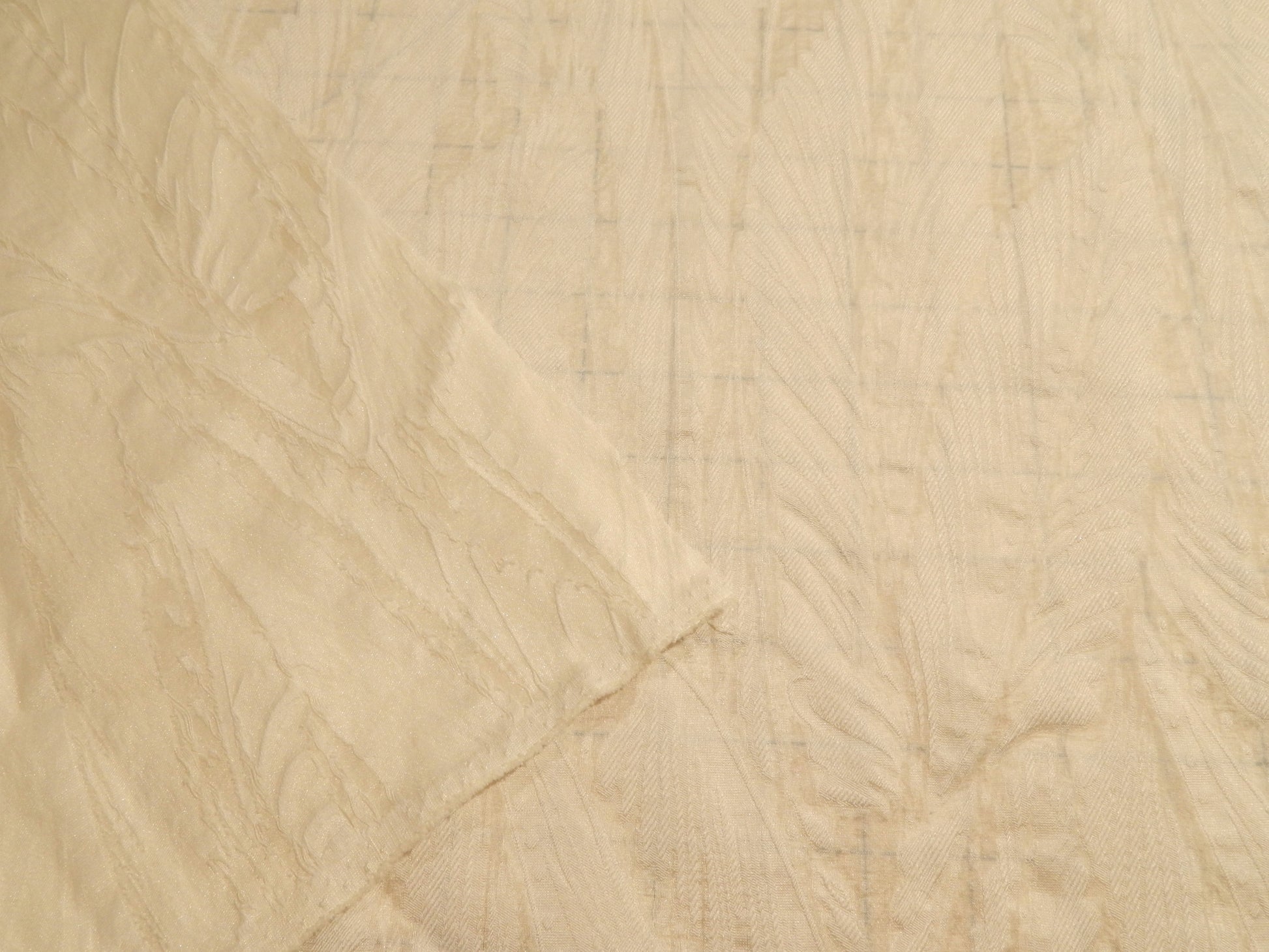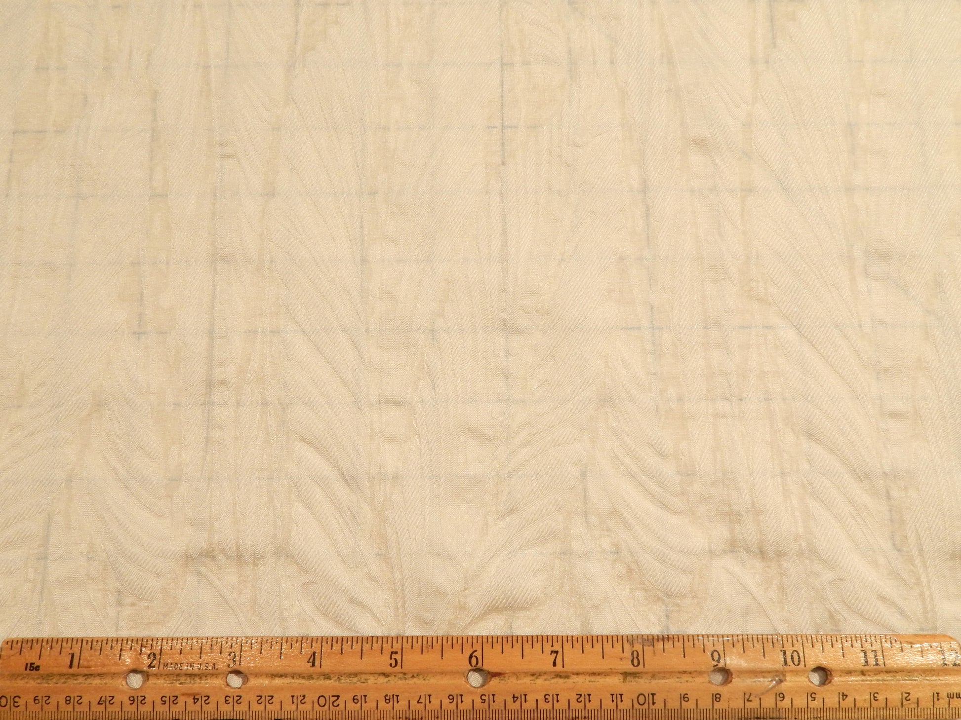 Use this ephemeral Seraphim Ivory Brocade fabric for you wedding dress that's got an enchanted feel. The barely-there feathers that grace the fabric are placed on a semi see through background and give it a mystical depth. This fabric is a very warm white and has a nice texture. It has a semi fluid drape to it and may need to be lined. This fabric is not reversible Use it for a simple and elegant evening jacket, a clerical robe, or for a wedding!