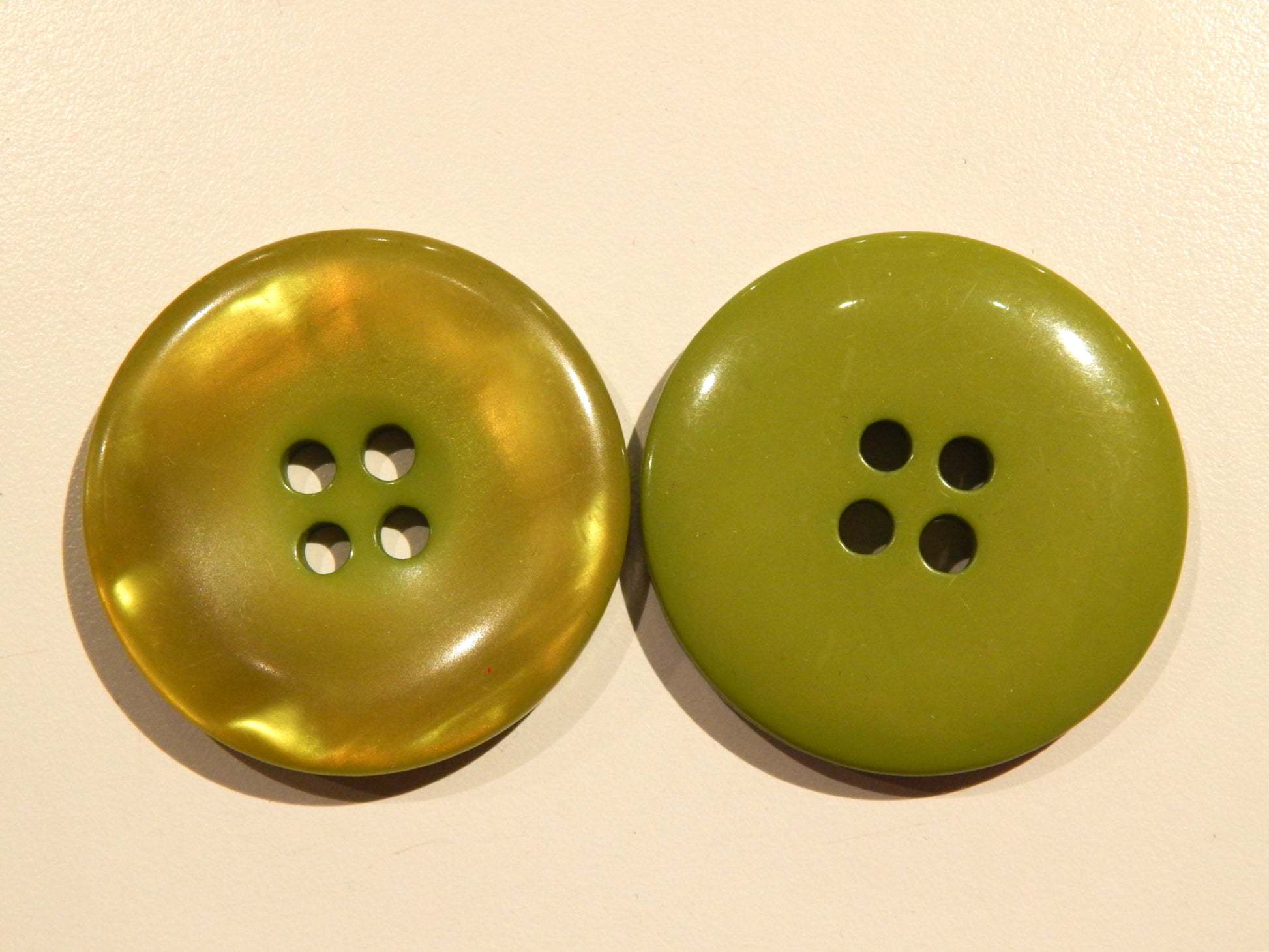 These gorgeous and nearly glowing Shimmery Bright Olive Green Buttons will elevate your design to the next level. There are many shades of the dark chartreuse reflecting off the face. These buttons are very well made and one would never guess they are plastic.