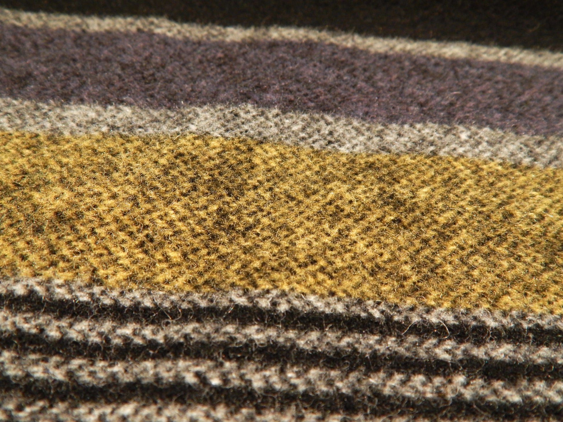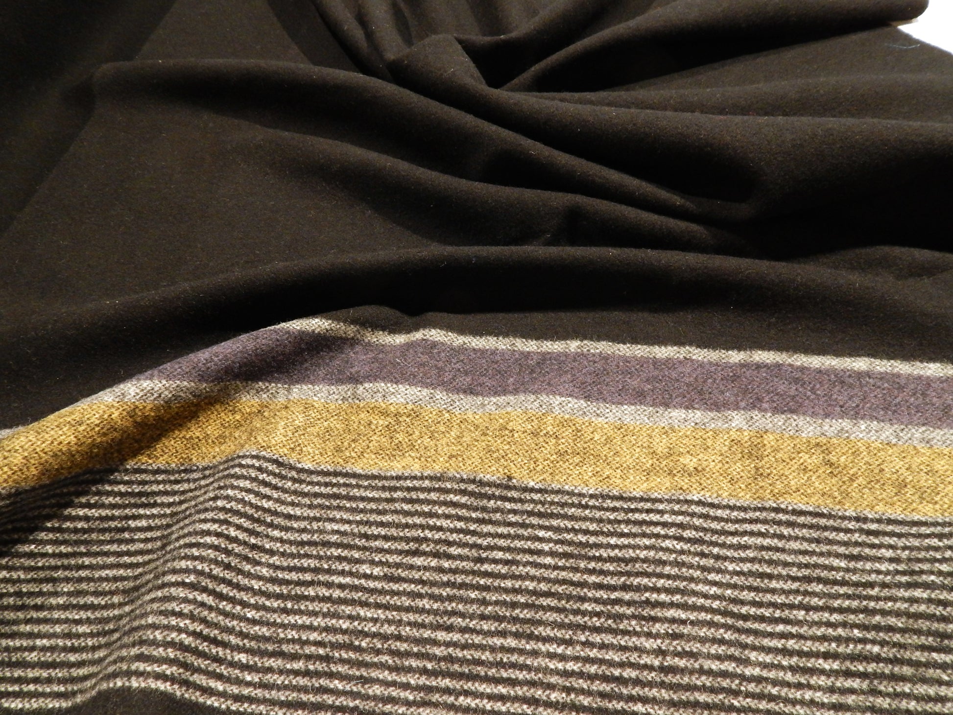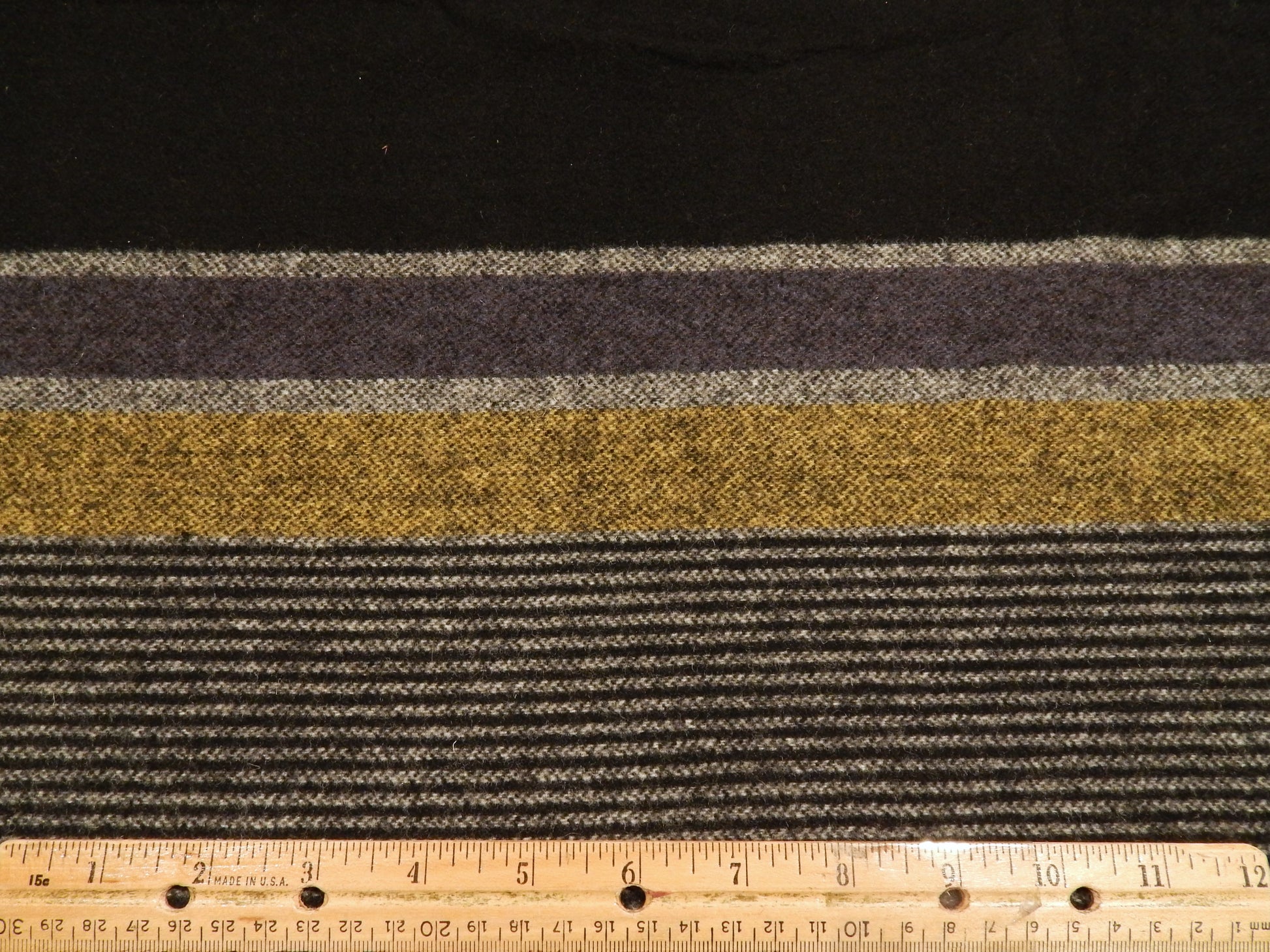 This stunning Violet, Chartreuse, & Black Wool Border Print is not only super soft, but also drapes really well. The stripes are only on one side, making it a single border, and perfect for making it into a long duster or cardigan. The contrasting colors of purple and yellow/green complement each other well and help to pep it up. Use this to create a beautiful pencil skirt, a bell sleeved jacket, or even a stylish bog coat.