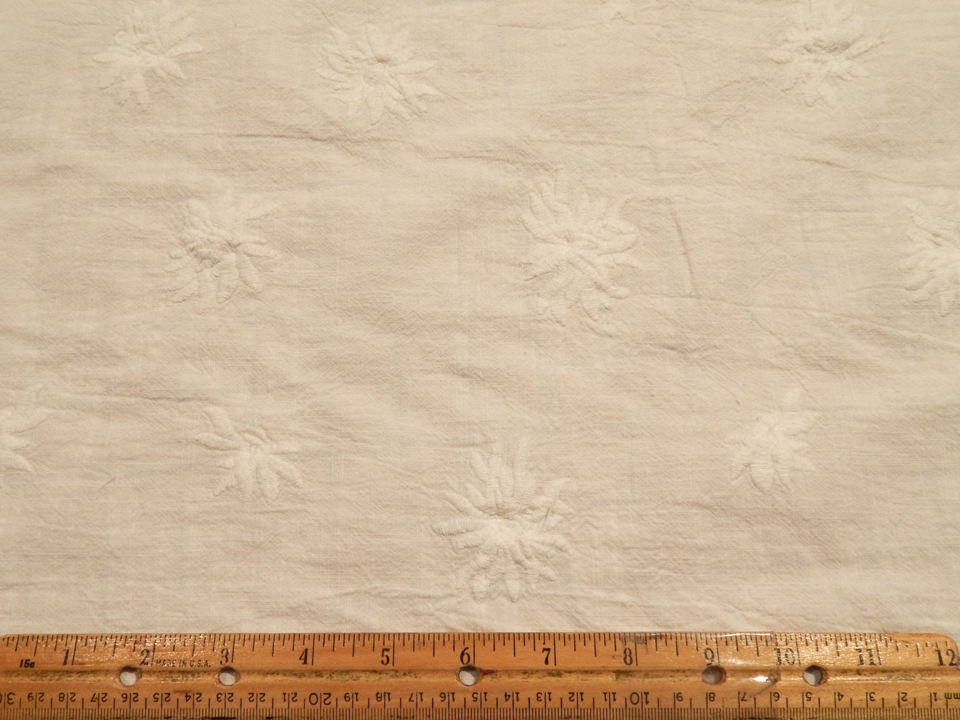 This White Floral Embroidery Linen/Cotton Blend fabric is both soft and beautiful. The large embroidered flowers are raised on the surface giving it a 3D appearance. The cotton in this fabric helps it to be less wrinkly and more uniform, while the linen gives it strength. While it's base color is white, it is not very see through and more plush than our other eyelets. This would work well for a Baptismal gown, a summer blouse, or even curtains!